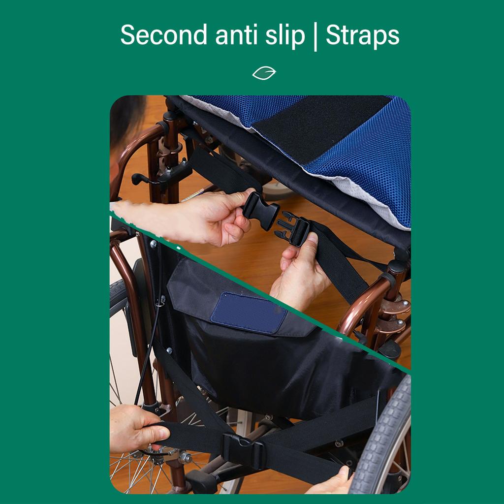 2. Тройной противоскользящий дизайн: Ограничитель, передние и задние ремни, прочные, надежно привязаны к подушке на инвалидной коляске, чтобы пожилые люди не скользили, частицы капельного литья, так что подушка устойчива и не двигается.