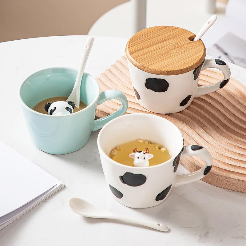 Мультяшная керамическая кофейная чашка Трехмерная кружка с украшением в виде панды с крышкой и ложкой Изысканная домашняя кружка для завтрака и молока Детский подарок Новинка