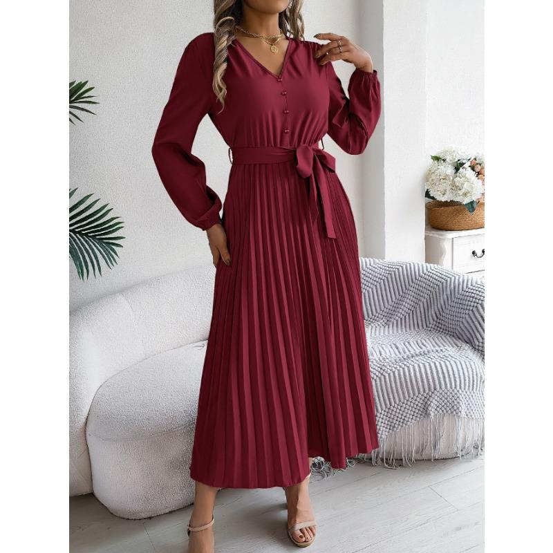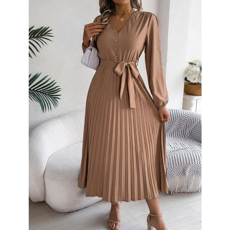 Весенне-осеннее женское платье темперамент элегантное с V-образным вырезом на пуговицах с завязками на пуговицах большое плиссированное длинное платье
