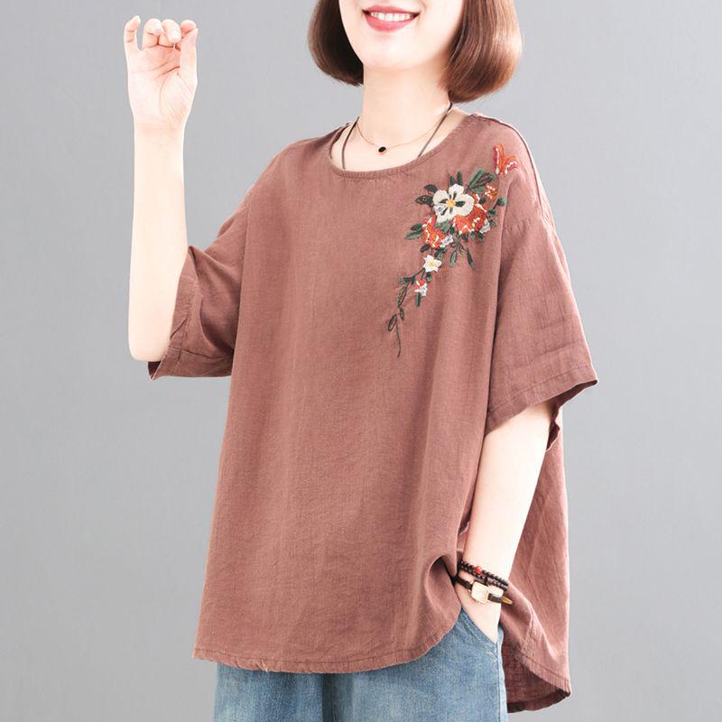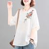 Женская ретро футболка в корейском стиле большого размера с вышивкой из хлопка и льна