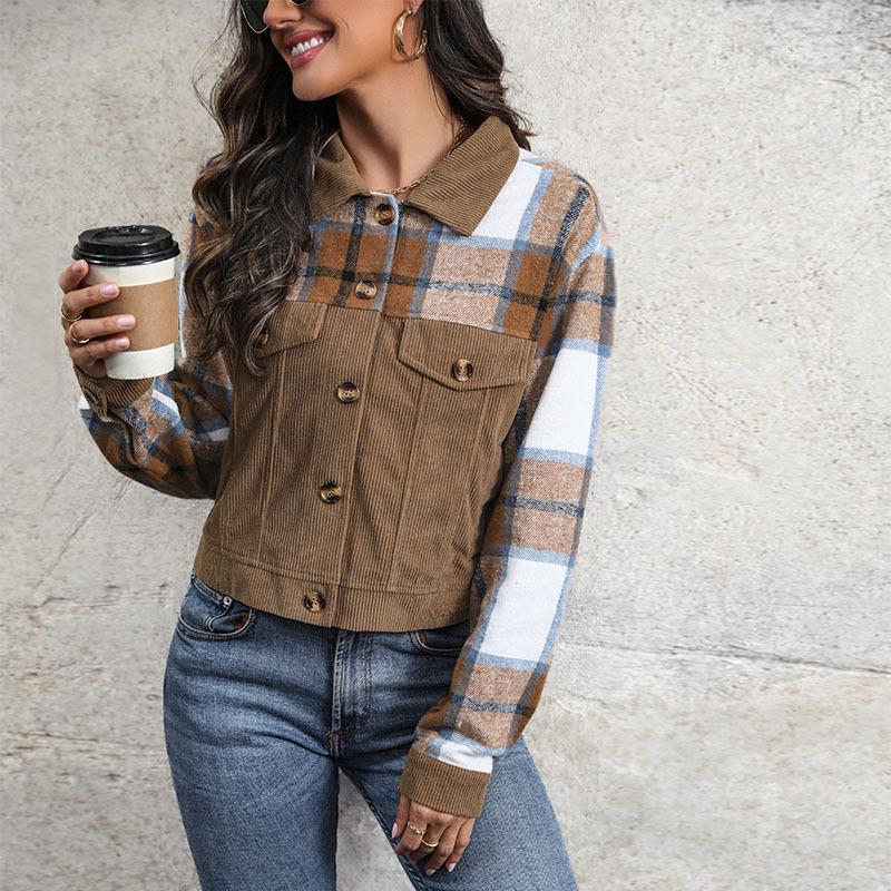 Весенне-осенний женский вельветовый клетчатый топ, винтажная куртка-кардиган с лацканами