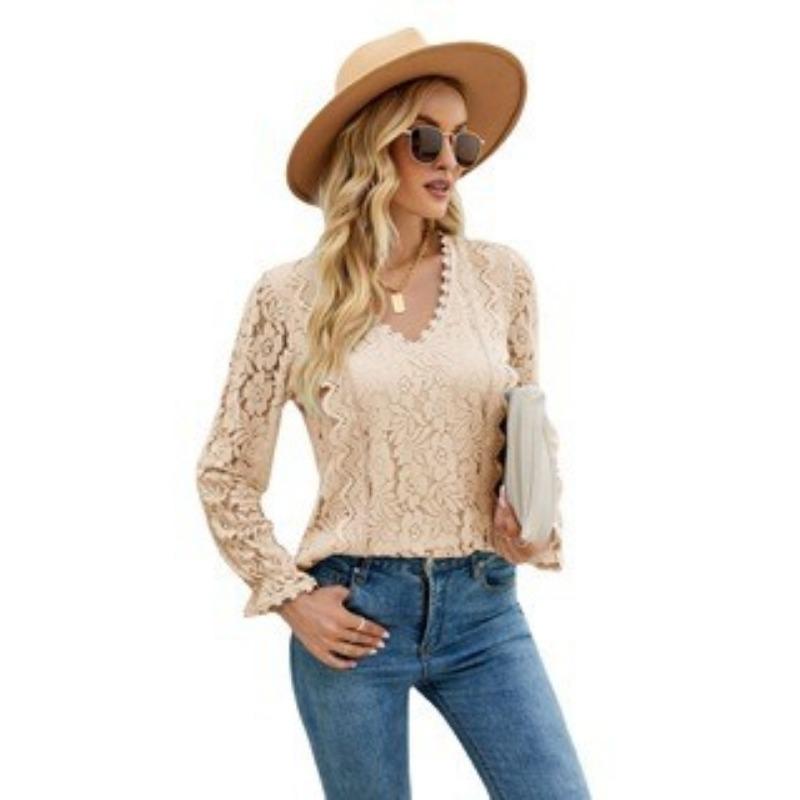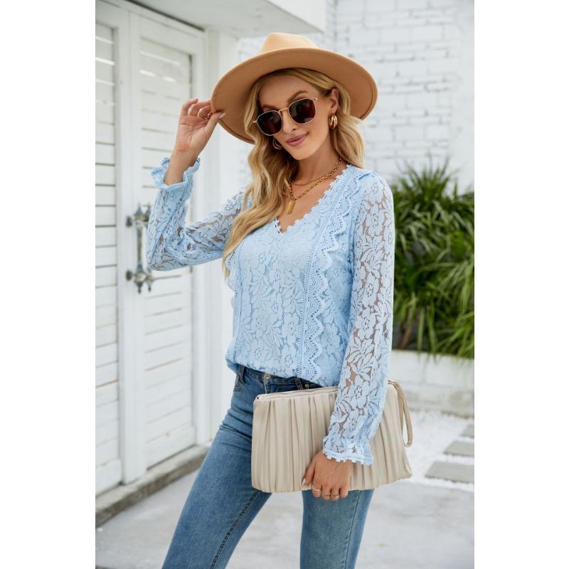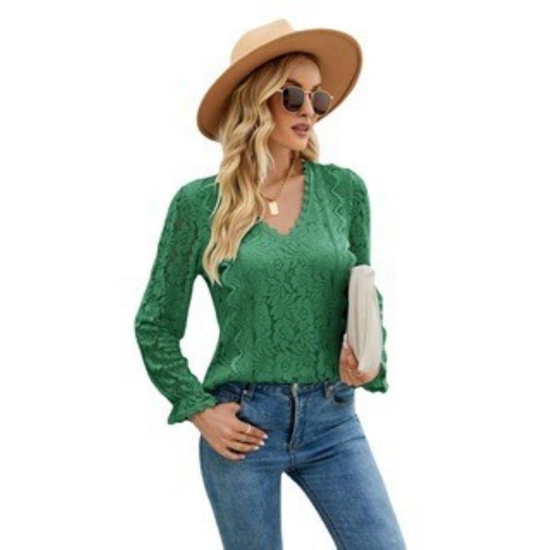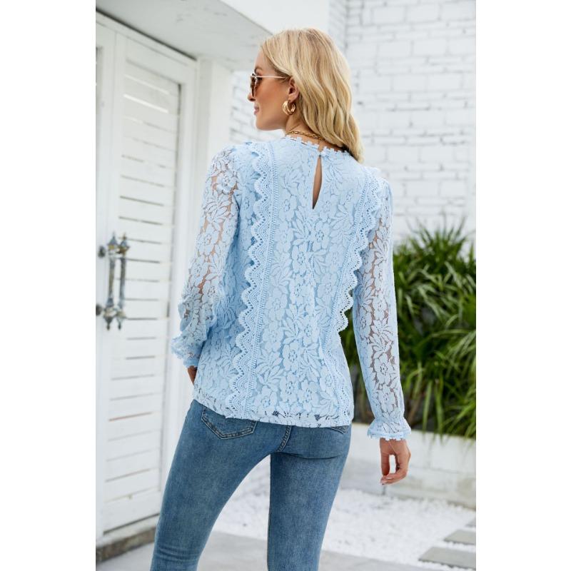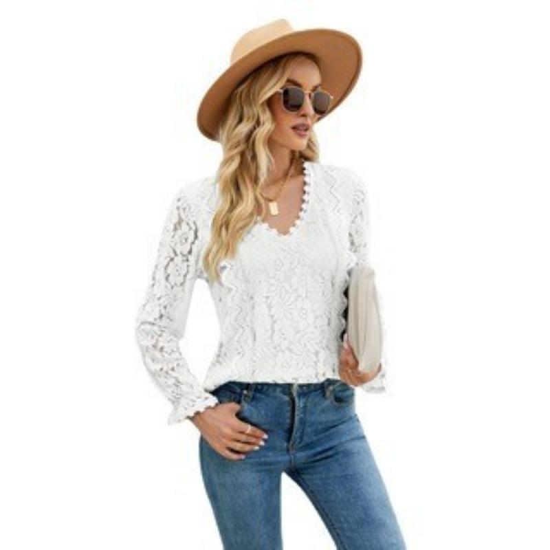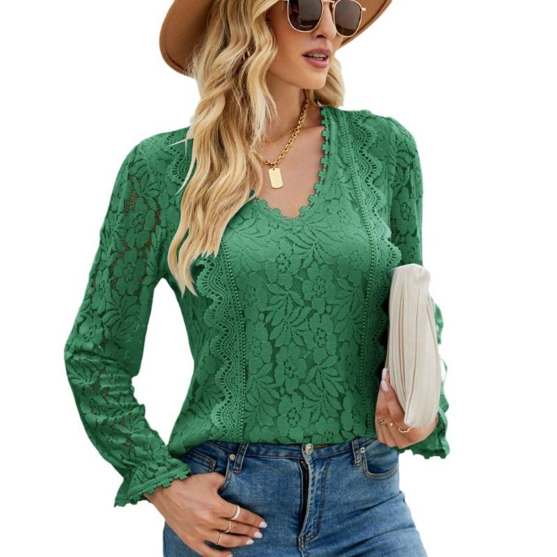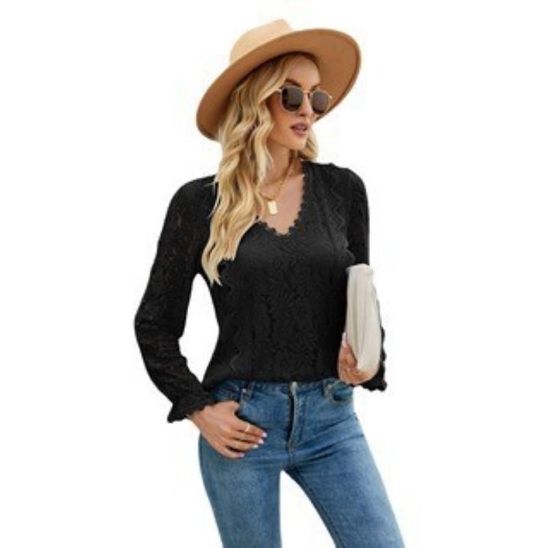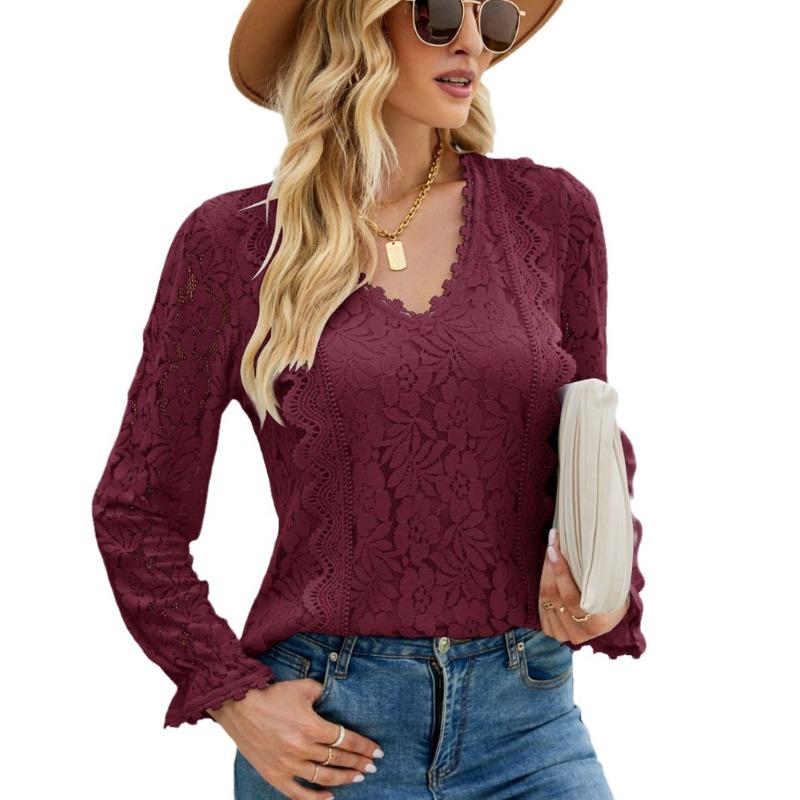 Весенне-осенняя женская блузка с длинными рукавами, однотонная, с ажурным кружевом, сексуальный трикотажный топ