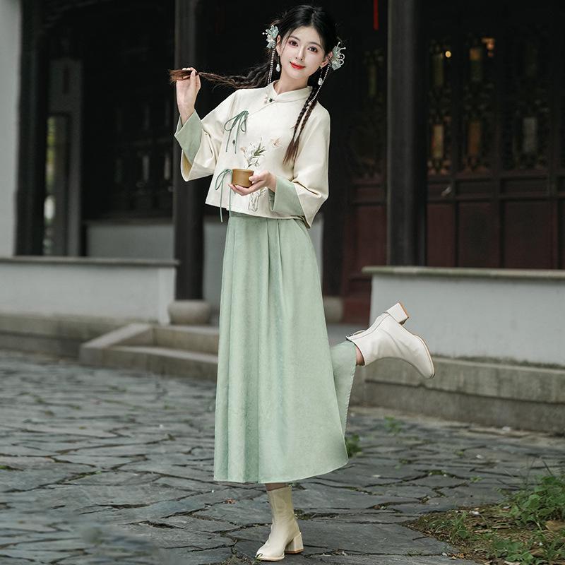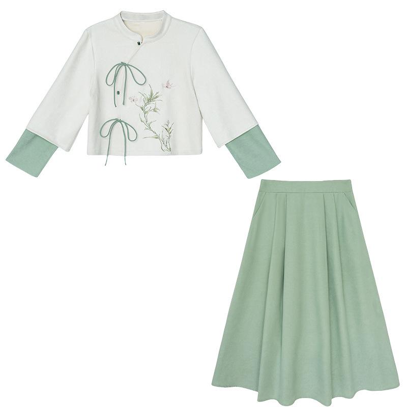Весенне-осенний ретро китайский вышитый костюм Тан: Воротник-стойка, Завязка в стиле Хан, Улучшенный двухпредметный чайный набор Ханфу