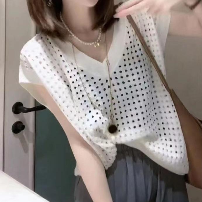 Летний тонкий ажурный трикотажный жилет с V-образным вырезом, женские топы — купить товар онлайн с бесплатной доставкой по всему миру!