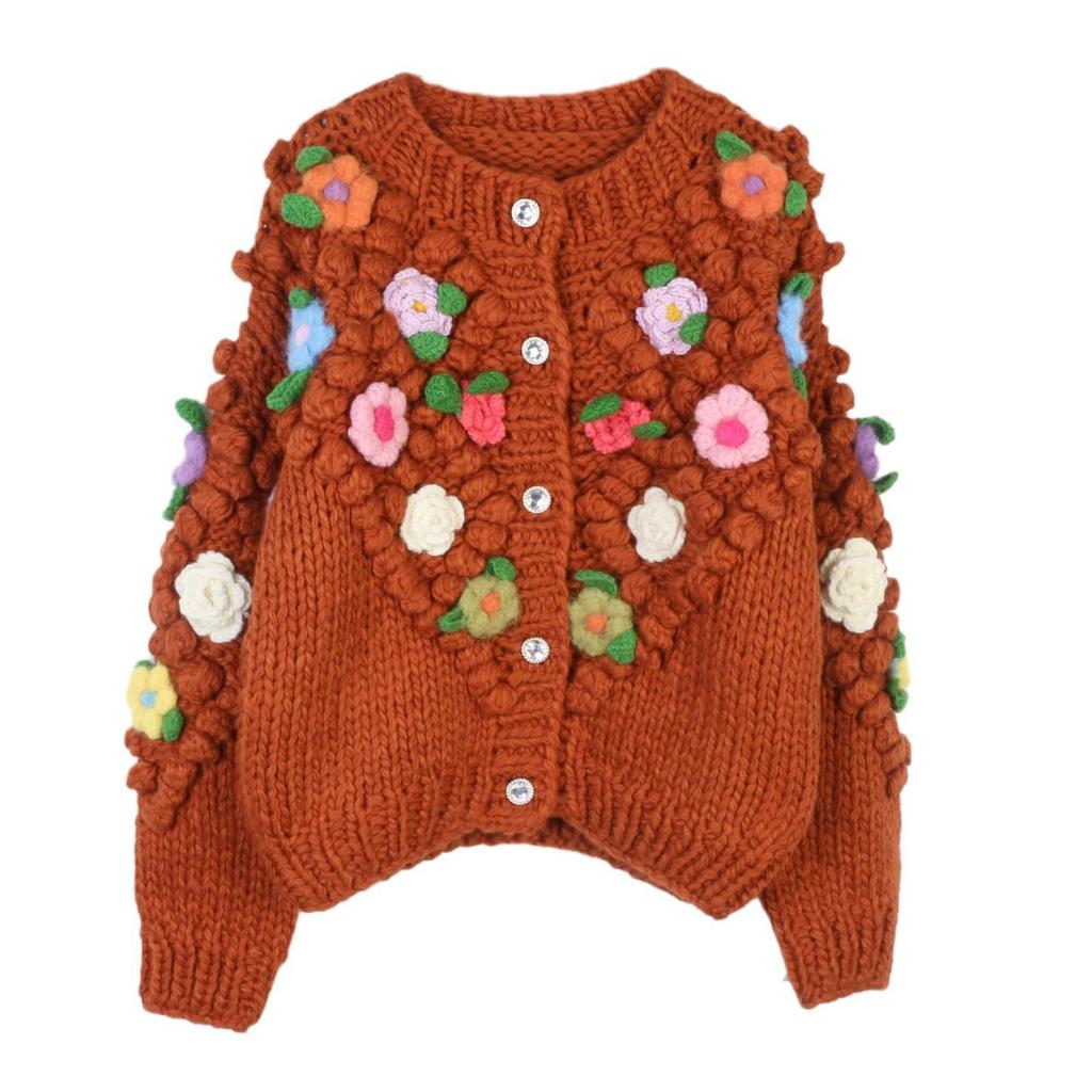 Женский кардиган с цветочным узором, круглым вырезом, длинными рукавами и кабельной вязкой