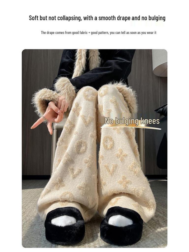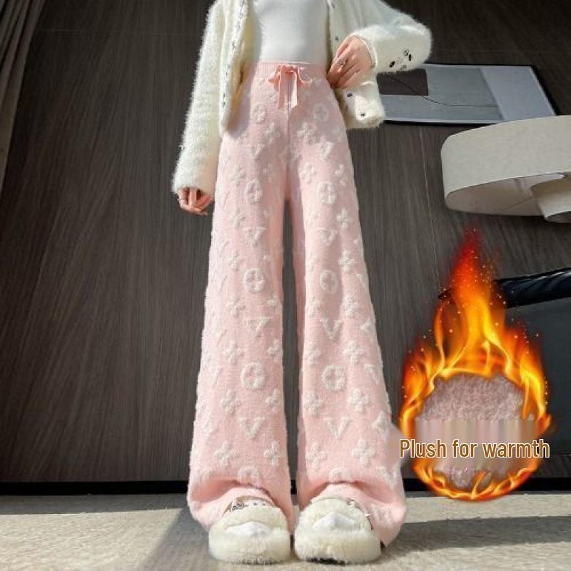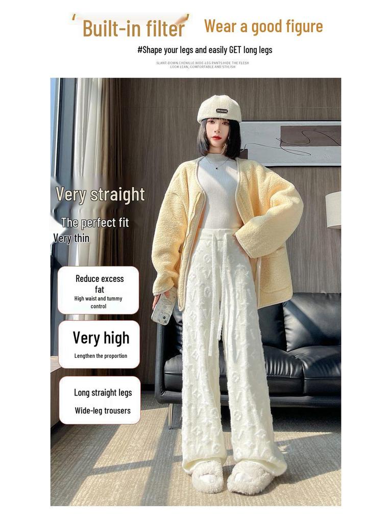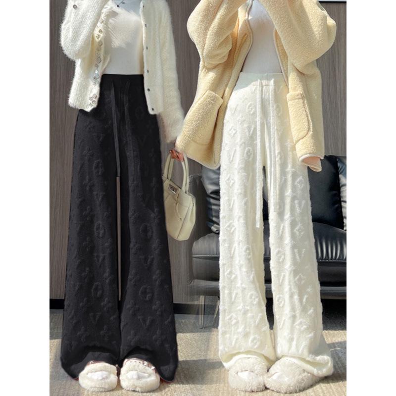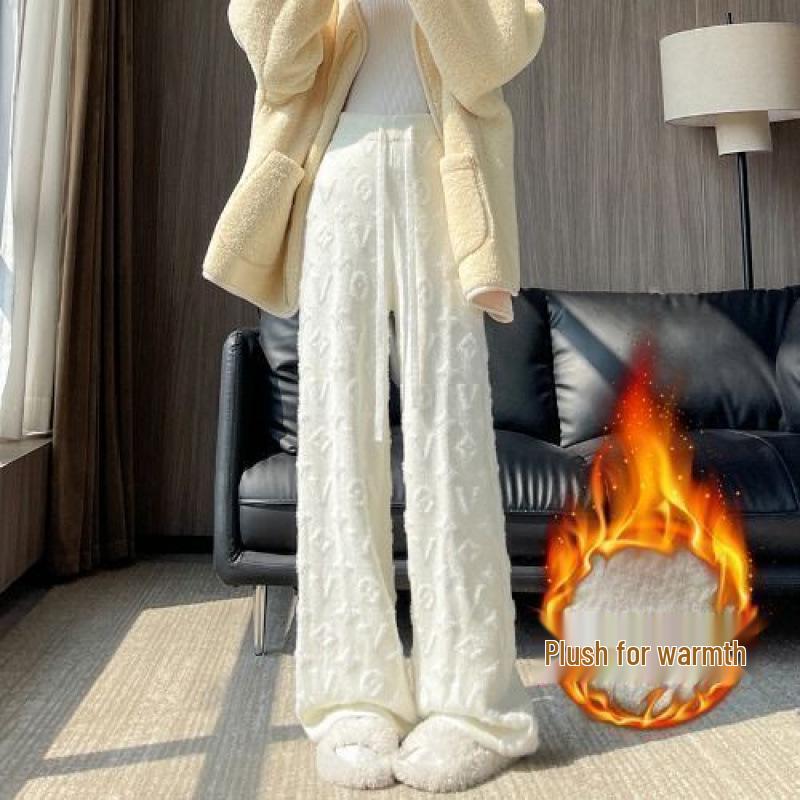 Женские белые вязаные брюки из норки с высокой посадкой и флисовой подкладкой, с широкими штанинами, повседневные, длиной до пола, осень/зима 2024.