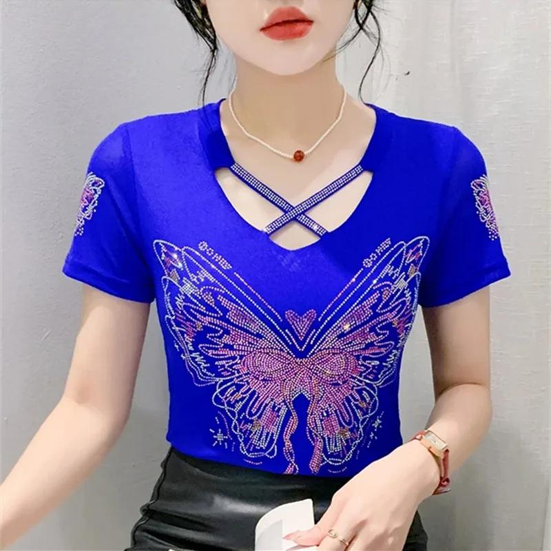 Высококачественный женский сексуальный топ с V-образным вырезом крест-накрест, блестящая футболка с бабочкой и горячими бриллиантами, летняя брендовая женская эластичная облегающая сетчатая футболка