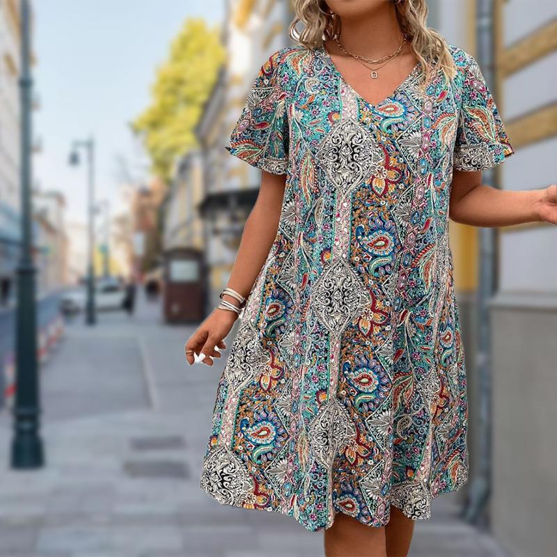 Летняя мода Женское платье с V-образным вырезом и коротким рукавом в стиле ретро с принтом Сексуальное короткое платье-юбка