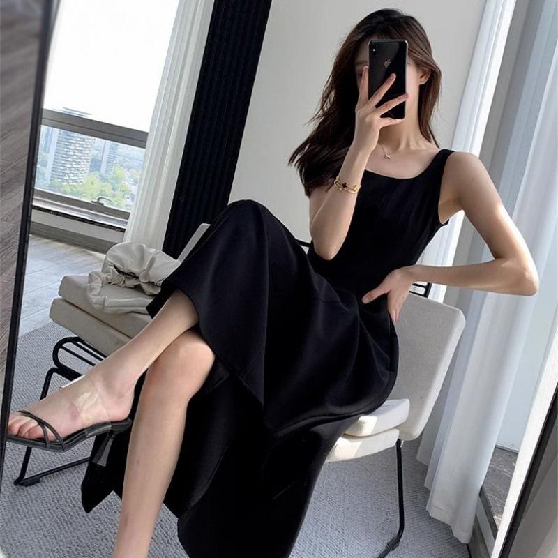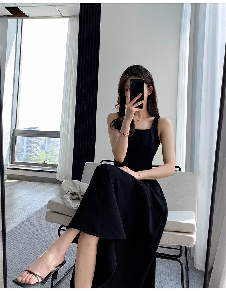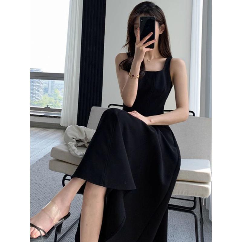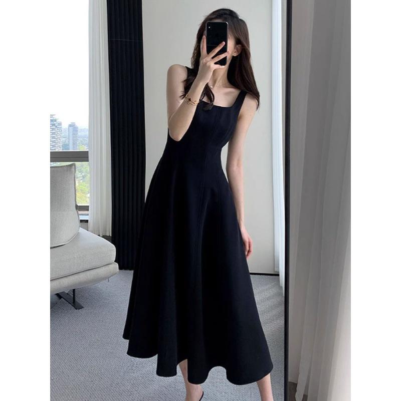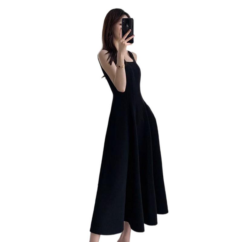 2024 Женское черное платье на тонких бретельках - Французский стиль, Приталенное, Вдохновленное Хепберн, Квадратный вырез, Завышенная талия, Длина до колена