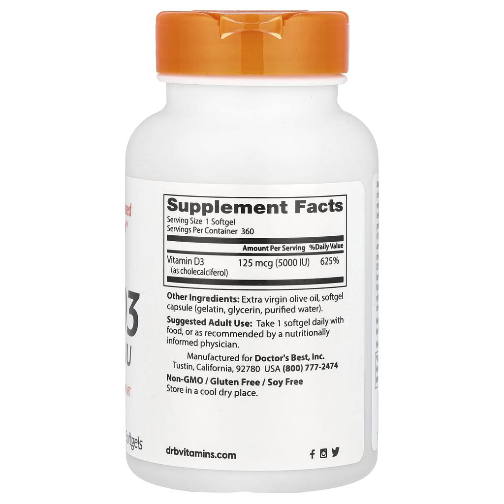 Doctor's Best Витамин D3, 125 мкг(5 000 МЕ), 360 мягких таблеток