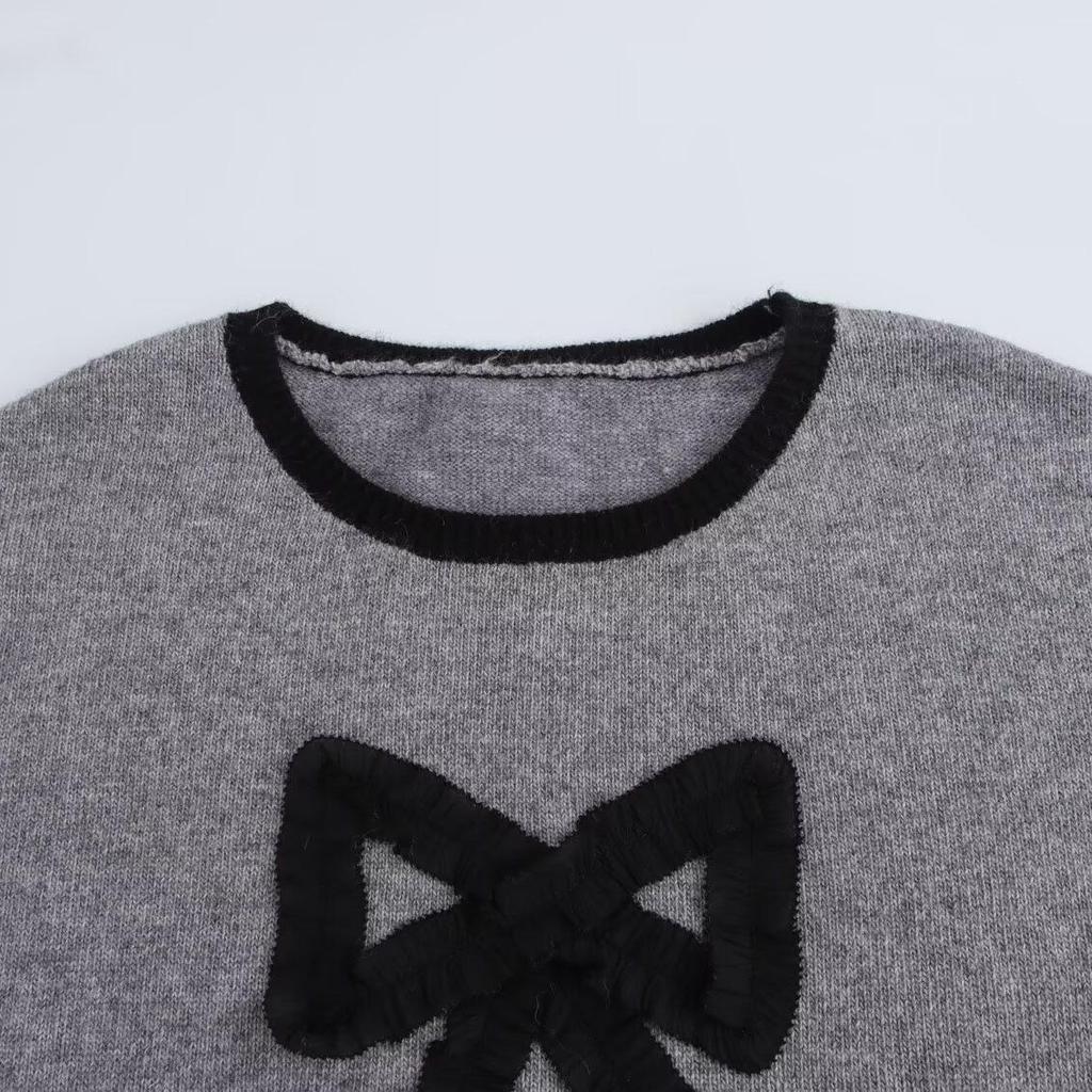 Женский трикотажный свитер в европейском и американском стиле на осень 2024 года, с 3D бантом, цветным блоком и круглым вырезом