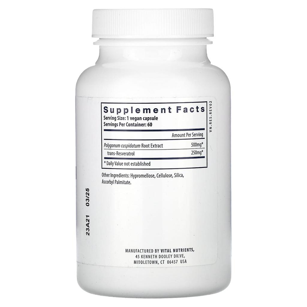 Ресвератрол — это полифенольное соединение, которое в природе существует как в виде цис-, так и транс-изомеров.. Транс-ресвератрол представляется основной активной формой. В основном содержится в красном вине, кожице красного винограда, соке фиолетового винограда и шелковице.. Он также содержится в нескольких растительных источниках, в частности в Polygonum cuspidatum. Ресвератрол быстро всасывается. Ресвератрол способствует здоровью сердечно-сосудистой системы и помогает поддерживать и сохранять коронарные кровеносные сосуды, функцию сердца и здоровую функцию тромбоцитов.. Это также помогает поддерживать здоровую активность циклооксигеназы и липоксигеназы.. Ресвератрол способствует укреплению сердца, поддерживает и сохраняет естественный рост клеток и действует как антивозрастное средство для увеличения продолжительности жизни.. Ресвератрол обладает антиоксидантной активностью. В некоторых моделях животных было показано, что он значительно снижает перекисное окисление липидов и способствует здоровому функционированию органов.