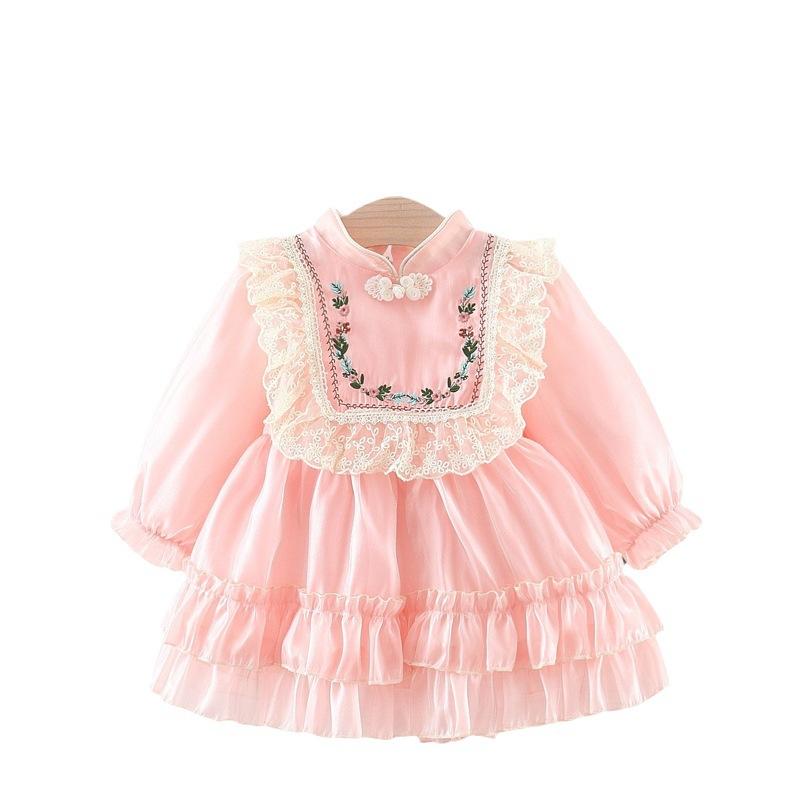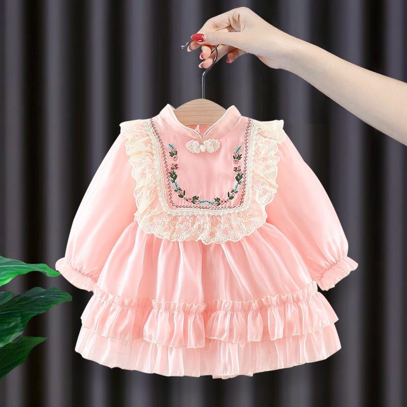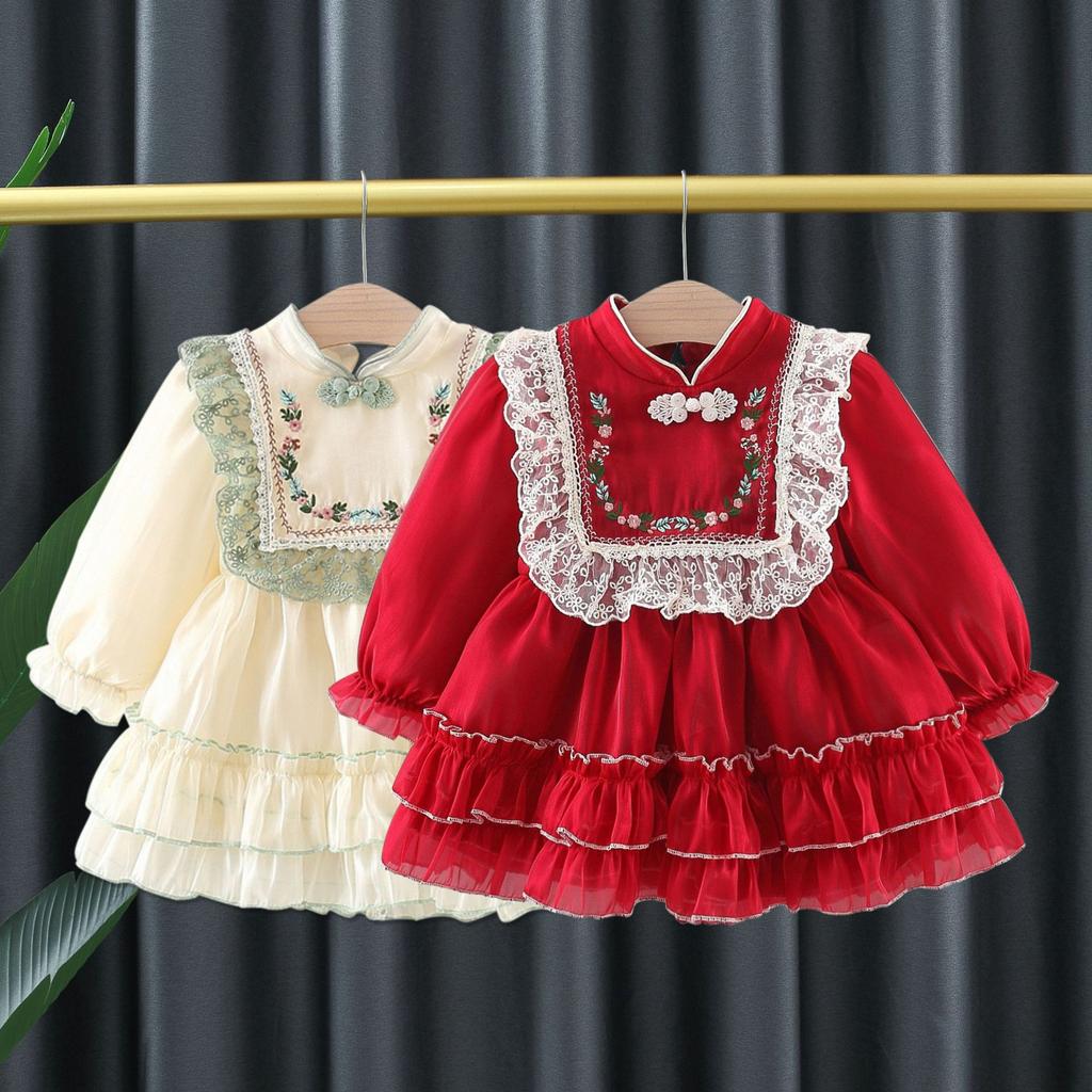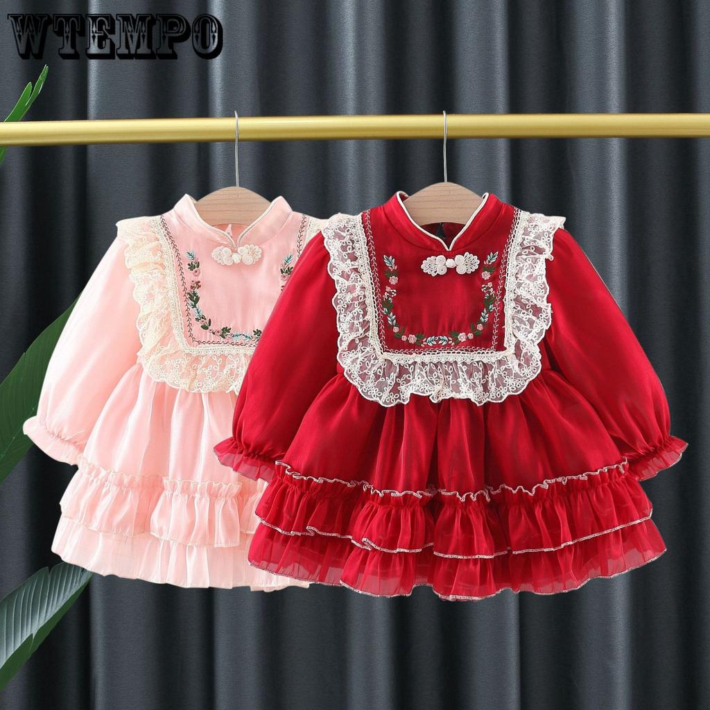 Детская одежда Платье для девочек Осень и зима Детское китайское кружевное вышитое платье принцессы с длинным рукавом для малышей