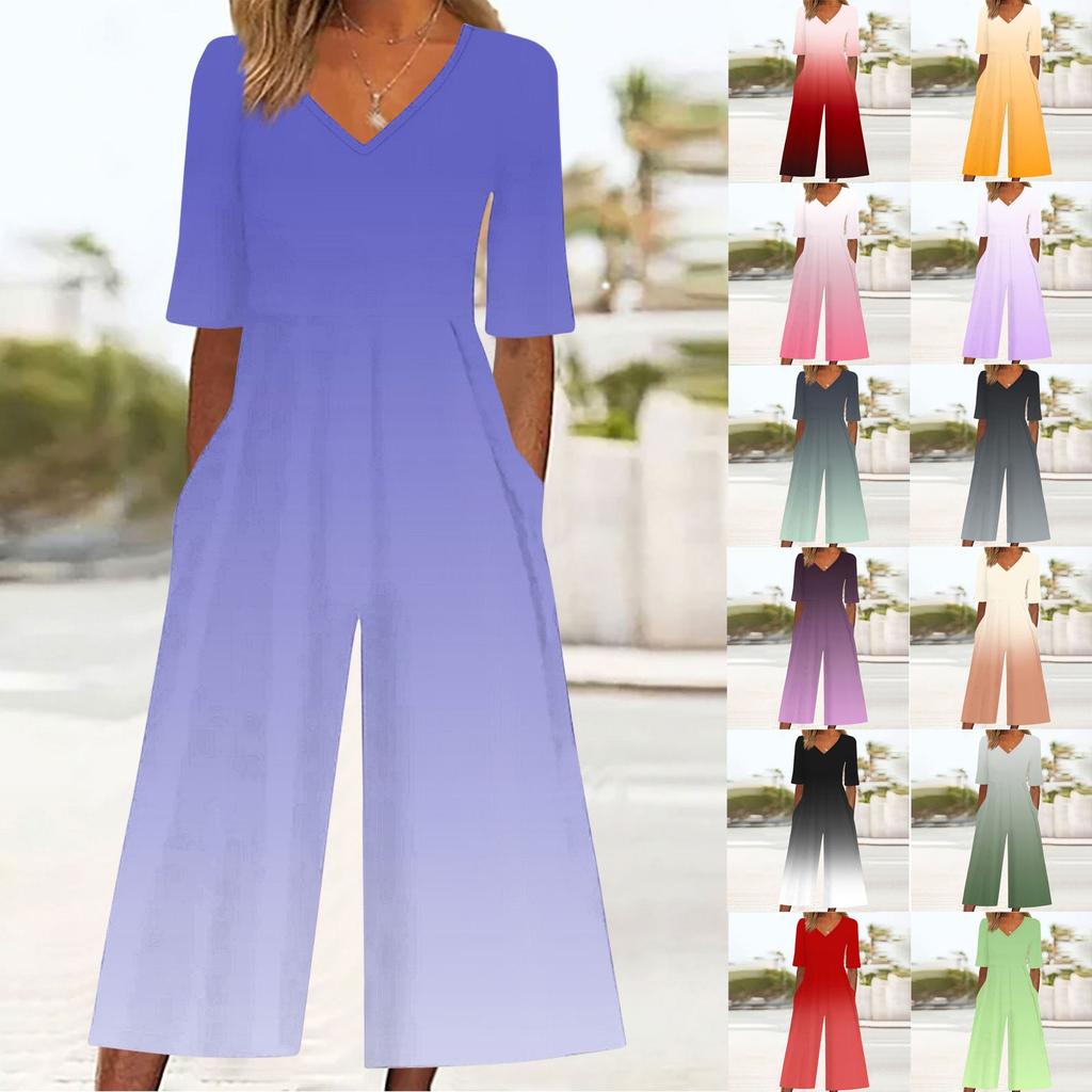 Женский свободный повседневный комбинезон с V-образным вырезом и градиентным принтом, приталенный, с широкими штанинами — купить товар онлайн с бесплатной доставкой до всему миру!