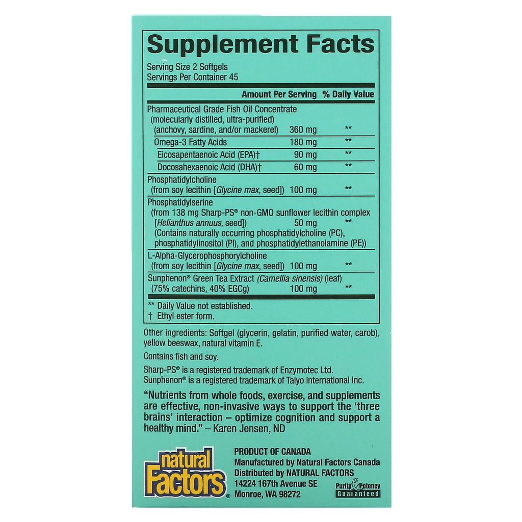 Ingredients: Softgel (glycerin, gelatin, purified water, carob), yellow beeswax, natural vitamin E. Contains fish and soy ingredients. No artificial colours, preservatives or sweeteners. No dairy, starch, sugar, wheat, gluten, yeast, egg, shellfish, salt, tree nuts or GMOs. Manufactured by Natural Factors to ensure safety and potency in accordance with FDA and Health Canada Good Manufacturing Practices (GMP).