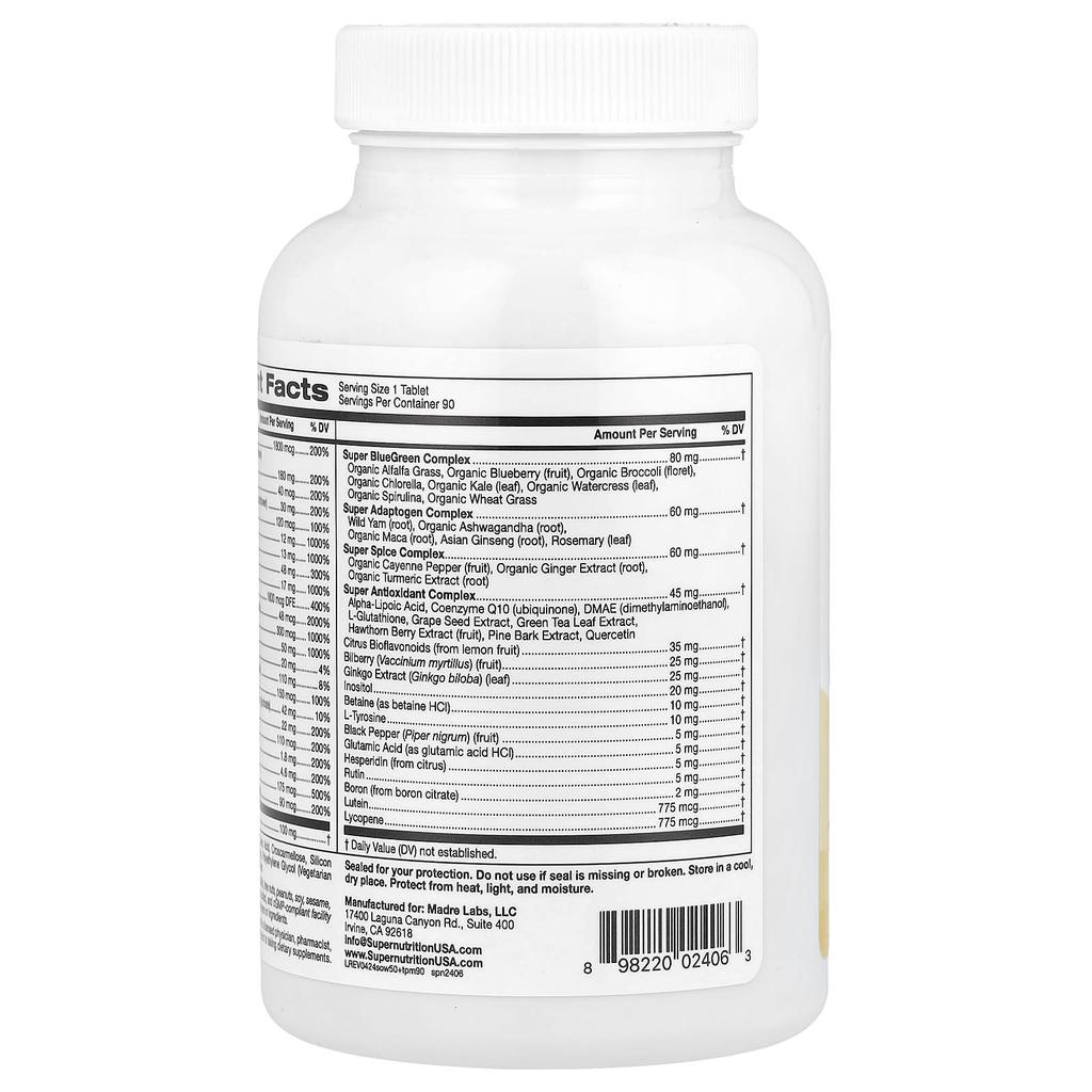 Vitamin A (Retinyl Palmitate 83%, Beta-Carotene 17%), Vitamin C (Ascorbic Acid), Vitamin D (D3, Cholecalciferol), Vitamin E (d-Alpha Tocopheryl Succinate from Sunflower), Vitamin K (K1, Phytonadione), Thiamin (ThiaminHCI), Riboflavin, Niacin (Nicotinic Acid and Niacinamide), Vitamin B6 (Pyridoxal-5-Phosphate), Folic Acid (5-MTHF, L-5-Methyltetrahydrofolic Acid), Vitamin B12 (Methylcobalamin and Dibencozide), Biotin (d-Biotin), Pantothenic Acid (D-Calcium Pantothenate), Choline (Choline Tartrate), Calcium (Calcium Carbonate/Calcium Citrate), Iodine (From Seaweed), Magnesium (Magnesium Oxide/Magnesium Glycinate), Zinc (Zinc Citrate), Selenium (sodium selenite), copper (copper glycinate), manganese (manganese sulfate), chromium (chromium picolinate), molybdenum (molybdenum amino acid chelate), l-phenylalanine, super blue-green complex, super adaptogen complex, super spice complex, powerful antioxidant complex, citrus bioflavonoids (from lemon fruit), bilberry (Vaccinium myrtillus) (fruit), ginkgo biloba extract (leaf), inositol, betaine (betaine HCl), l-tyrosine, pepper (Piper nigrum) (fruit), glutamic acid (glutamic acid HCl), hesperidin (from citrus fruits), rutin, boron (from boron citrate), lutein, lycopene