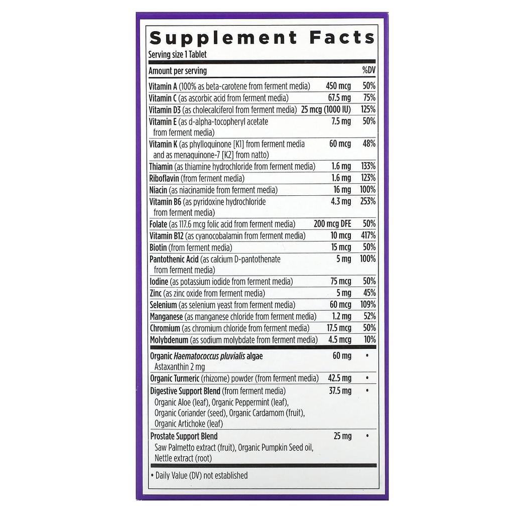 Product Description: Established in 1982Formula that aids absorptionMade with organic vegetables and herbsCertified Organic by Where Food Comes From OrganicNSF Certified Gluten-FreeNon-GMO Project VerifiedKosherSupplement100% VeganNo artificial flavors/colorsCertified by B Corp.Nutrient Benefits: Supports immune, heart, digestive, and prostate healthThe magic inside: Fermented and blended superfood herbs and astaxanthin with essential nutrients your body can recognize.Complete Multivitamin Only for Men 55+Our formula is expertly formulated to support the holistic health of men 55+, including nutrients for brain, eye, bone, and prostate health; stress, mood, vision, and digestive health; and hair, skin, and nail health. Does not contain iron.Immune & Energy SupportSupports immune health with vitamins C, E,† and astaxanthin, a rare phytonutrient derived from organic algae. 8 fermented B vitamins support cellular energy metabolism. Heart Health Vitamin D3 supports cardiovascular health, including supporting blood pressure.*Comprehensive HerbalsInspired by traditional methods and backed by science, advanced botanicals include saw palmetto, organic turmeric, and aloe. Superior AbsorptionWe carefully balance the levels of each high-quality vitamin and mineral, select the type that best suits your body, and ferment the key nutrients with probiotics and whole foods. †This is not the only source of these nutrients, and a healthy diet is essential.