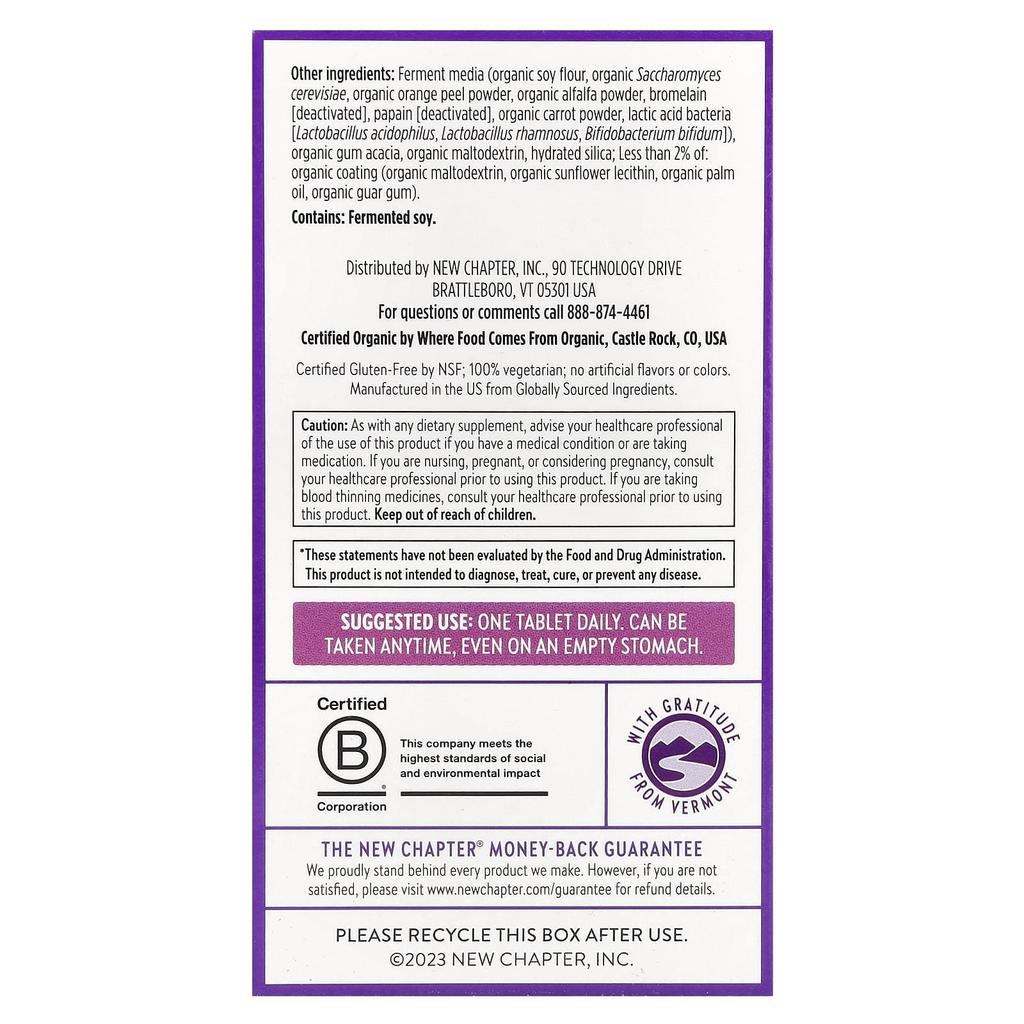Ingredients: Fermentation Media (Organic Soy Powder, Organic Brewer's Yeast, Organic Orange Peel Powder, Organic Alfalfa Powder, Bromelain [Inactivated], Papain [Inactivated], Organic Carrot Powder, Lactic Acid Bacteria [Lactobacillus Acidophilus, Lactobacillus Rhamnosus, Bifidobacterium Bifidum]), Organic Acacia Gum, Organic Maltodextrin, Hydrated Silica; Less than 2%: Organic Coating (Organic Maltodextrin, Organic Sunflower Lecithin, Organic Palm Oil, Organic Guar Gum). Contains: Fermented Soy. Made in the USA with Imported Ingredients.