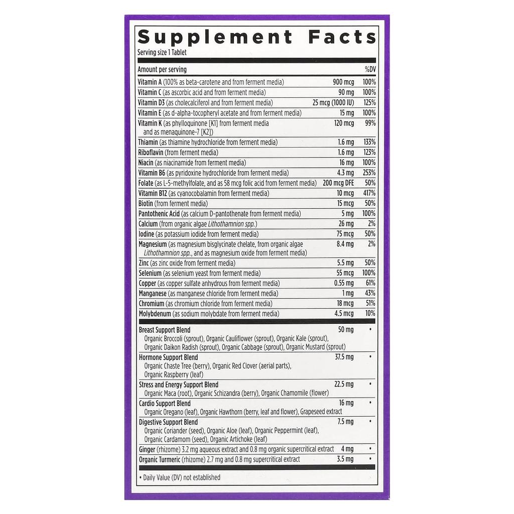 Product Description: Established in 1982Formula that aids absorptionMade with organic vegetables and herbsWhere Food Comes From OrganicNon-GMO Project VerifiedGluten Free NSF CertifiedKosher SupplementWhere Food Comes From OrganicCertified Organic100% VegetableFree of artificial flavors/colorsB. corp. CertifiedGratitude from VermontNutrient Benefits: Supports Immunity, Energy, and Healthy AgingThe Magical Ingredient Inside: Essential nutrients your body can recognize, fermented and blended with superfood herbs and hormonal-supporting chaste tree.Complete Multivitamin for Women Over 40Expertly formulated to support the comprehensive health needs of women over 40, including nutrients for heart, brain, bone, and breast health, stress relief, digestion, and hair, skin, and nail health.Immunity & Energy BoostFermented zinc† and vitamins C and A support immune system function, while eight B vitamins support energy metabolism.Aid the Healthy Aging ProcessProvides essential vitamins for women over 40, including vitamin B12 to help maintain eye health and vitamin C to support skin.Comprehensive Herbal Inspired by traditional methods and backed by science, advanced organic botanicals include turmeric, red clover, and broccoli sprouts.Superior AbsorptionWe carefully balance the levels of each high-quality vitamin and mineral, selecting the types that work best for your body, and blending them with probiotics and natural Fermented with food to provide key nutrients. †Not the only source of these nutrients, a healthy diet is essential.