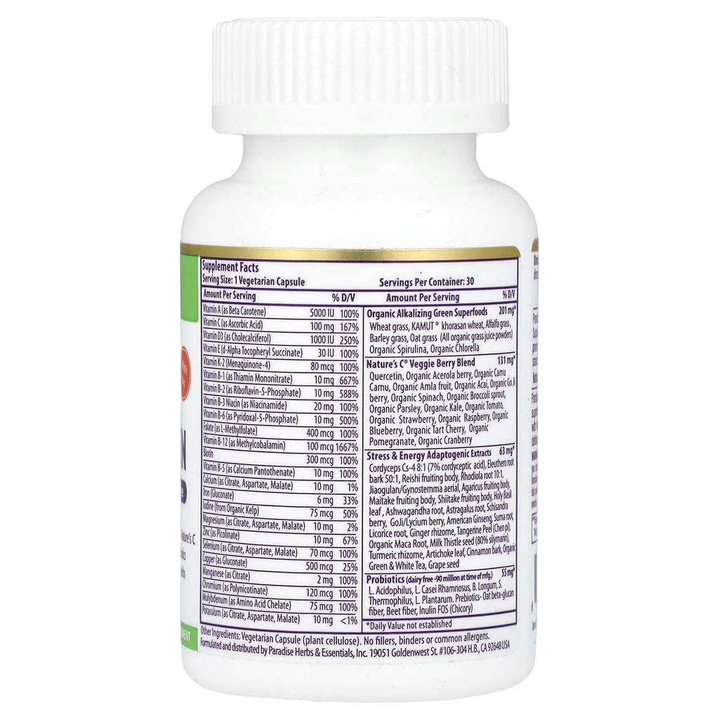 Описание товара: Премиальное качество более 25 лет ORAC Energy Greens + Витамин C от природы + Минералы + Пробиотики + Адаптогены + Травы Подходит для вегетарианцев Изготовлено из ингредиентов без ГМО Без глютена Победитель премии Best of Supplements - Изготовлено из щелочного зеленого сока премиум-качества, богатого питательными веществами, усиливающего чудеса природы с 1994 года Содержит оригинальную запатентованную формулу Greens Подходит для вегетарианцев Синергетическая польза от настоящих цельных продуктов - Nature Synergized™ Награжденная Earth's Blend от Paradise - это настоящий синергизированный природой мультивитамин-суперфуд. Эта формула сочетает в себе пользу настоящих, цельных витаминов, минералов, адаптогенов, пробиотиков, трав и многого другого, чтобы выйти за рамки простого восполнения дефицита и поддержать здоровье всего организма.. Мощная антиоксидантная поддержка от суперфудов Свободные радикалы — это реактивные вещества, которые могут негативно влиять на нормальную физиологическую функцию. Пять основных типов свободных радикалов (гидроксил, пероксил, пероксинитрит, синглетный кислород и супероксид-анион) может вызывать широкий спектр дегенеративных заболеваний. Антиоксиданты служат жизненно важной линией защиты, блокируя атаки свободных радикалов на ДНК, основные белки, липиды и аминокислоты.. Общий ORAC (Способность поглощать кислородные радикалы) Анализ Недавние технологии сделали возможным комплексный новый метод тестирования под названием Total ORAC assay. Тест Total ORAC измеряет общее воздействие суперфудов, витаминов и антиоксидантов на основные свободные радикалы в организме.. Paradise — инновационный лидер в категории мультивитаминов, суперфудов и антиоксидантов, предлагающий формулы, которые борются со всеми типами свободных радикалов, выходя за рамки простого восполнения дефицита, чтобы помочь улучшить общее состояние здоровья.. Качество • Чистота • Эффективность Продукты Paradise признаны лучшими добавками более 10 лет. Мы стремимся находить ингредиенты высочайшего качества, отвечающие самым высоким стандартам в отрасли.. Без ненужных наполнителей В отличие от других планшетов, содержащих связующие вещества, наполнители, стеарат магния или стеариновую кислоту (что может мешать всасыванию), наши вегетарианские капсулы быстро растворяются в желудочно-кишечном тракте. В нашем процессе инкапсуляции не используются излишние наполнители, связующие вещества, стеариновая кислота, искусственные красители, ароматизаторы или консерванты.. Максимальное усвоение Мы используем наиболее растворимый и усваиваемый минеральный хелат (Кребс) в сочетании с лимонной кислотой и аспартатом-малатом для обеспечения наиболее активной, усваиваемой организмом формы витаминов B2, B6 и B12. Антиоксидантная сила, эквивалентная 7 порциям фруктов и овощей Наша оригинальная формула ORAC-Energy Greens обеспечивает антиоксидантную силу более чем 7 порций фруктов и овощей (ORAC4000+) всего в одной вегетарианской капсуле. Адаптогены для снятия стресса и повышения энергии Наша премиальная формула мультивитаминов из суперфудов содержит адаптогенные экстракты высочайшего качества, включая родиолу розовую, ашваганду, святой базилик, астрагал и лимонник.. Наши адаптогены для борьбы со стрессом способствуют повышению энергии, концентрации, жизненных сил и общего самочувстви