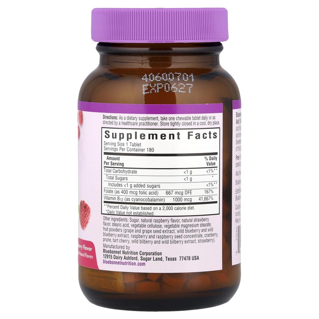 Product Description : Supplement with Other Natural Flavors Vegan Kosher Parve Gluten Free Cellular Energy Production and Nervous System Health Bluebonnet's EarthSweet® Chewable Vitamin B12 and Folic Acid Tablets are made with crystalline vitamin B12 and folic acid in a delicious raspberry flavor to support cellular energy production and nervous system health. Sweetened with EarthSweet®, a blend of fruit powder and cane sugar crystals.