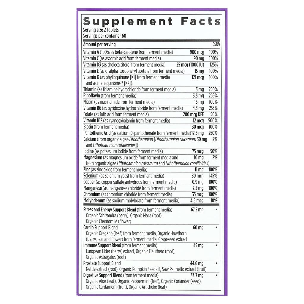 Product Description: Established in 1982Formula for AbsorptionContains Organic Vegetables and HerbsWhere Food Comes From OrganicCertified OrganicNon-GMO Project VerifiedGluten-Free NSF CertifiedKosher SupplementGratitude from Vermont100% VeganNo Artificial Flavors/DyesNutrients: Supports Immune, Heart, Energy, Stress and Brain HealthThe Magic Inside: Essential Nutrients Blended with Superfood Herbs, Including Elderberry, Turmeric and Saw Palmetto†In a Higher Potency Your Body Can RecognizeComplete MultivitaminA Rich Source of Nutrients for MenProvides 2-Daily Capsules to Support Men’s Overall Health and FunctionBenefitsFermented Zinc and Vitamins C & A Support Immune Function, while 8 B Vitamins Support Energy MetabolismRecent studies have shown that fermented Vitamin D3 supports cardiovascular health. Organic Herbs Provides advanced botanicals inspired by tradition and backed by science, including saw palmetto, organic turmeric, and maca. Superior Absorption We carefully balance the levels of each high-quality vitamin and mineral, select the type that best suits your body, and ferment the key nutrients with probiotics and whole foods. B. Corp.® Certified We meet the highest standards for social and environmental impact. † Compared to Every Man™’s One Daily Multivitamin, this blend has higher levels of thiamine, riboflavin, vitamins B6 and B12, selenium, manganese, and chromium.