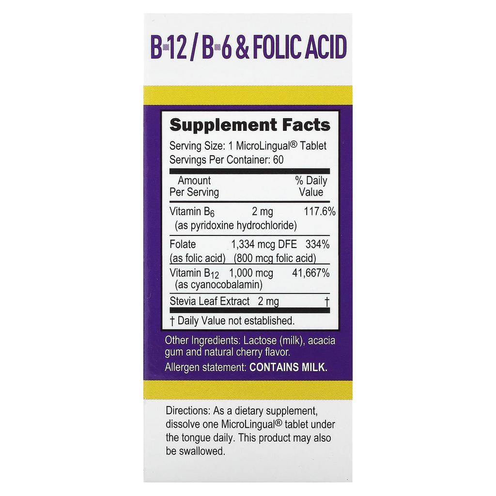 Cyanocobalamin B-12, B-6 and Folic Acid, Instant Dissolve Microlingual 60 Tablets