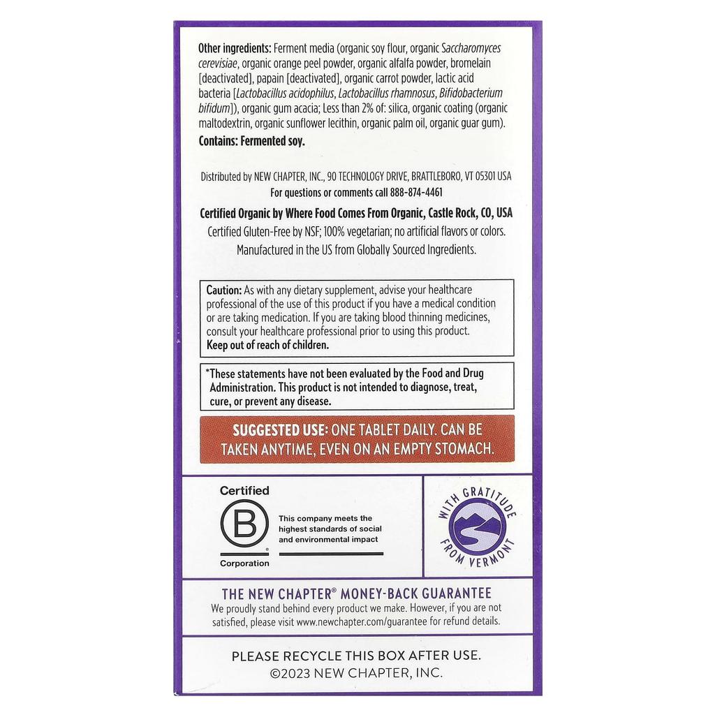 Ingredients: Fermentation medium (organic soybean powder, organic brewer's yeast, organic orange peel powder, organic alfalfa powder, bromelain [inactivated], papain [inactivated], organic carrot powder, lactic acid bacteria [lactobacillus acidophilus, lactobacillus rhamnosus, bifidobacterium bifidum]), organic acacia gum (less than 2%) Contains: silica, organic coating (organic maltodextrin, organic sunflower lecithin, organic palm oil, organic guar gum). Contains: Fermented soybeans. Manufactured in the USA with imported ingredients.