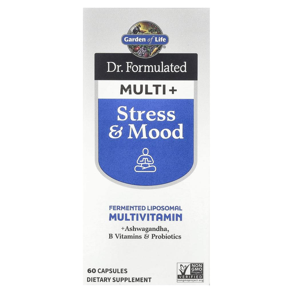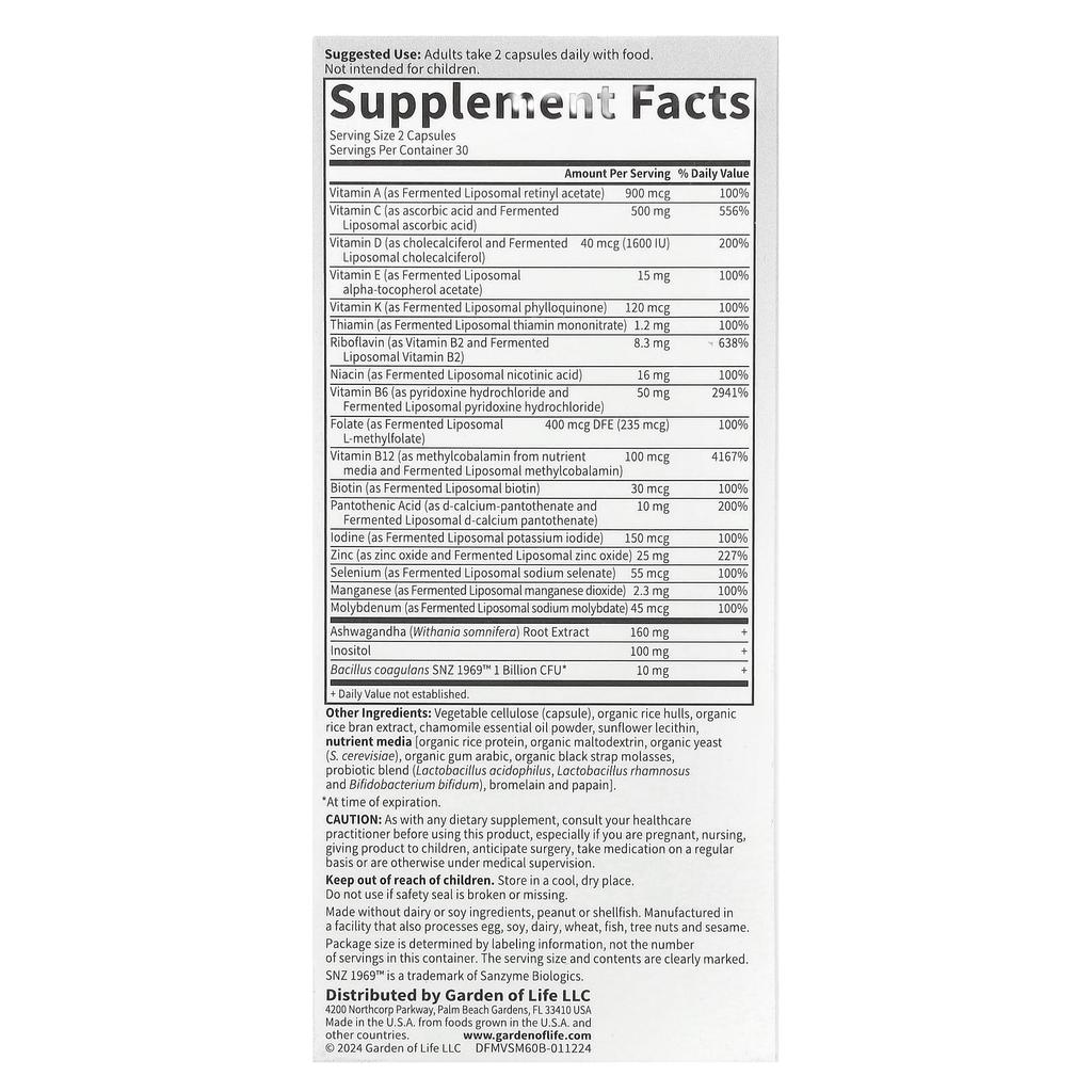 Product Description: Fermented Liposomal Multivitamin + Ashwagandha, B Vitamins, and Probiotic SupplementNon-GMO Project CertifiedVegetable-Based NSF - Gluten-Free CertifiedB. Corp. CertifiedPerlmutter A formula that provides the nutrients you need in a convenient daily multivitamin, including Ashwagandha and B Vitamins to help manage stress. Supports a positive, calm, and relaxed mood. Supports a healthy cortisol response. Helps with intermittent stress. Digestive and Immune Health. Created by Dr. David Perlmutter, M.D., a member of the American Dietetic Association and America’s leading expert on the microbiome. Probiotic Fermented “Whole Food” Multivitamin Formulated with patented liposomal technology to promote nutrient absorption. Adds clinically studied probiotics to promote healthy digestive function. 1 billion CFU* Bacillus coagulans SZ 1969™*As of expiration date.