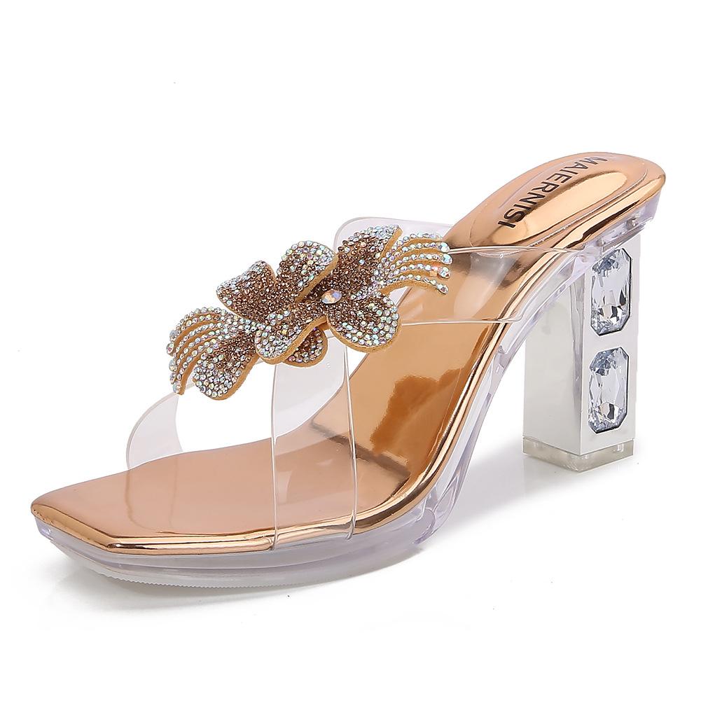 Летние шлепанцы с бантом из страз, крест-накрест, на высоком каблуке из прозрачного кристалла, сексуальные