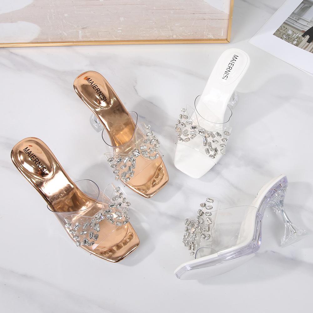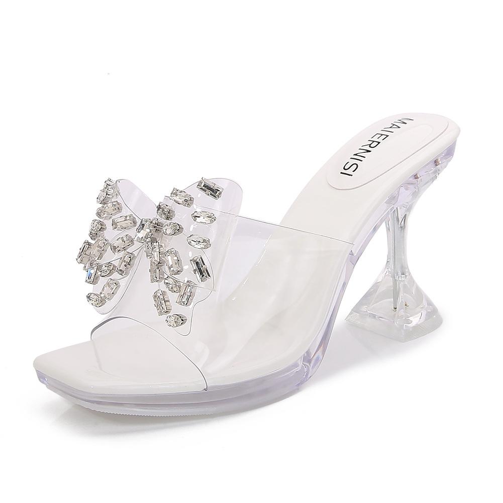 Прозрачные крутые шлепанцы с бантиком из стразов, летние новинки, квадратный носок, фееричный темперамент, хрустальные сандалии, рюмка и высокие каблуки