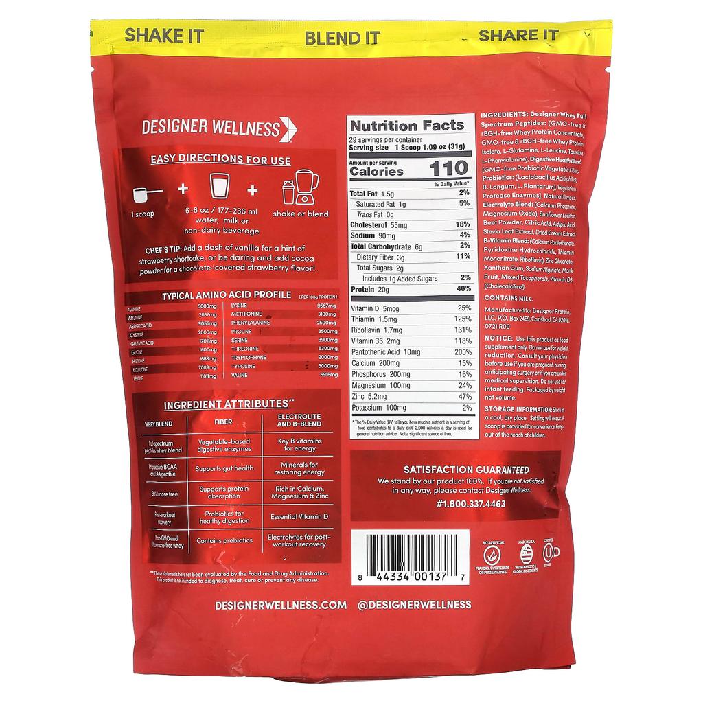 Product Description: Natural Flavor with Probiotics 20g of Protein Per Serving 100% of Key B-Vitamins to Boost Energy and Metabolism 110 Calories Per Serving No Added Sugar Non-GMO Whey rBGH Free Whey Gluten Free Certified Kosher 100% Natural Whey Protein Whey rBGH Free from Milk Made with No Artificial Growth Hormones No Artificial Antibiotics Leading the Way in Protein-Rich Nutrition Since 1993 - Natural Protein with Added Nutritional Benefits *Designer Protein is a leader in high-quality nutritional products. Our range includes proteins and superfoods designed for fitness, strength and weight management and overall wellness. Protein-Rich Nutrition100% whey protein with plant-based digestive enzymes and full-spectrum peptides to aid in protein absorption, B vitamins to help convert protein into usable energy, calcium, vitamin D, phosphorus, magnesium, zinc, probiotics and electrolytes for post-workout recovery. Contains natural prebiotic vegetable fiber to help keep you feeling full and less hungry. Natural whey from Midwestern cattle raised on a diet free of artificial growth hormones or antibiotics. No artificial colors, flavors, sweeteners or preservatives. No gluten, no added sugar, and 97% lactose free. (per 100 g protein) Amino Acid Profile Alanine 5000 mg Arginine 2667 mg Aspartic Acid 9056 mg Cysteine 2000 mg Glutamic Acid 17011 mg Glycine 1600 mg Histidine 1683 mg Isoleucine 7089 mg Leucine 11011 mg Lysine 9667 mg Methionine 3100 mg Phenylalanine 2500 mg Proline 3500 mg Serine 3900 mg Threonine 8300 mg Tryptophan 2000 mg Tyrosine 3000 mg Valine 6916 mg