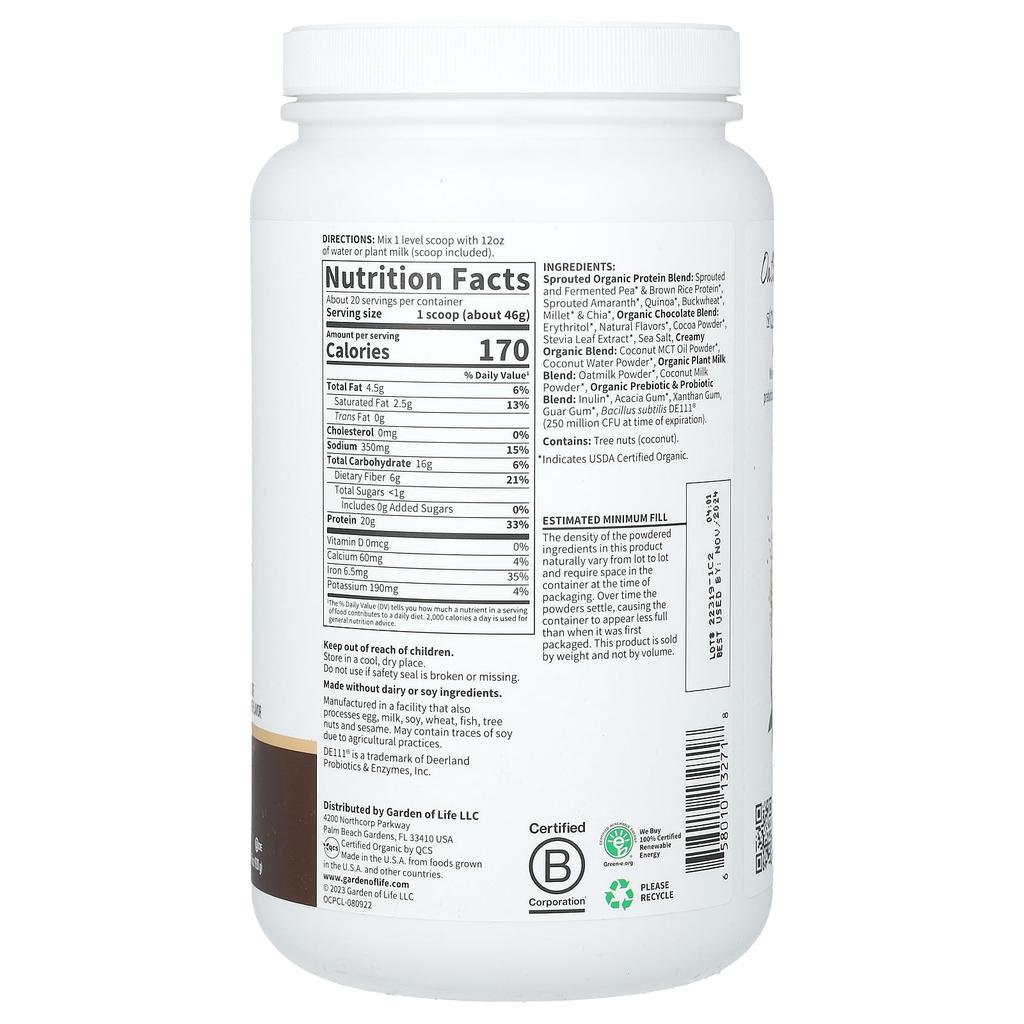 ингредиенты: Органическая белковая смесь с проростками: Протеин из пророщенного ферментированного гороха* и пророщенного ферментированного гороха*, коричневый рис*, пророщенный амарант*, киноа*, гречка*, пшено* и чиа*, органическая смесь какао*: Эритрит*, Натуральные ароматизаторы*, Какао-порошок*, Экстракт листьев стевии*, Морская соль, Кремовая органическая смесь: Кокосовое масло MCT в порошке*, Кокосовая вода в порошке*, Органическая смесь растительного молока: Порошок овсяного молока*, Порошок кокосового молока*, Органическая смесь пребиотиков и пробиотиков: Инулин*, Камедь акации*, Ксантановая камедь, Гуаровая камедь*, Bacillus Subtilis DE111® (250 миллионов КОЕ со сроком годности). Содержит: Лесные орехи (Кокос). * Указывает на органическую сертификацию USDA. Не содержит молочных или соевых ингредиентов. Не содержит яиц, молока, сои. Произведено на предприятии, где перерабатывается пшеница, рыба, древесные орехи и кунжут.. Может содержать следы сои из-за сельскохозяйственной практики.. Сделано в США с использованием продуктов, выращенных в США и других странах.