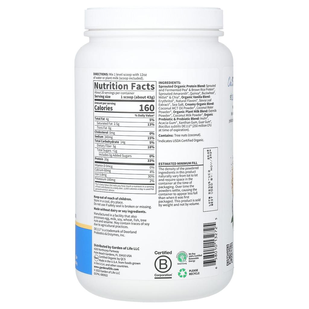 Sprouted Organic Protein Blend: Sprouted Fermented Pea* and Sprouted Fermented Pea* Brown Rice Protein*, Sprouted Amaranth*, Quinoa*, Buckwheat*, Millet* & Chia*, Organic Vanilla Blend: Erythritol*, Natural Flavors*, Stevia Leaf Extract*, Sea Salt, Creamy Organic Blend: Coconut MCT Oil Powder*, Coconut Water Powder*, Organic Vegetable Milk Blend: Oat Milk Powder*, Coconut Milk Powder*, Organic Prebiotic & Probiotic Blend: Inulin*, Acacia Gum*, Xanthan Gum, Guar Gum*, Bacillus Subtilis DE111® (250 million CFU with shelf life).