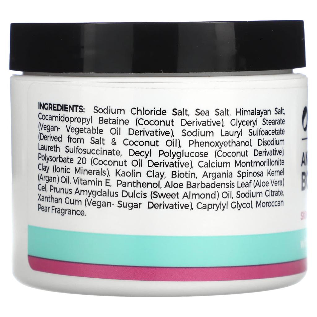 sodium chloride salt, sea salt, himalayan salt, cocamidopropyl betaine (coconut derivative), glyceryl stearate (vegan vegetable oil derivative), sodium lauryl sulfoacetate (derived from salt and coconut oil), phenoxyethanol, disodium laureth sulfosuccinate, decyl polyglucose (coconut derivative), polysorbate 20 (coconut oil derivative), calcium montmorillonite clay (ronic mineral), kaolin clay, biotin, argania spinosa kernel oil, vitamin e, panthenol, aloe barbadensis leaf gel, sweet almond (prunus amygdalus dulcis) oil, sodium citrate, xanthan gum (vegan sugar derivative), caprylyl glycol, moroccan pear fragrance.