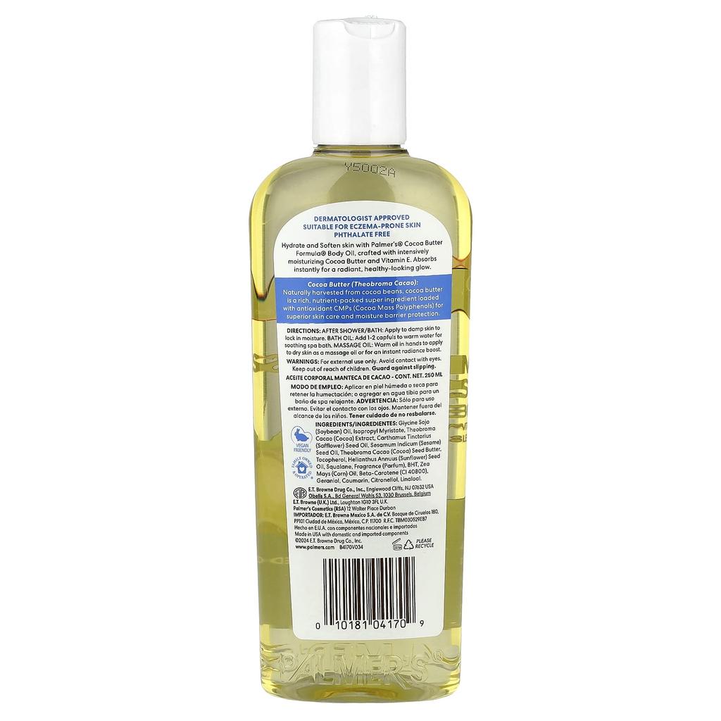 Описание товара: Содержит витамин Е Для ванны и душа В 2 раза более длительное увлажнение 48 часов Мгновенно питает сухую кожу Без ингредиентов животного происхождения, НЕ тестируется на животных Для всей семьи Увлажните и смягчите кожу с помощью масла для тела Palmer's @ Cocoa Butter Formula @, изготовленного с увлажняющим какао-маслом и витамином Е. Он мгновенно впитывается в кожу, оставляя ее со здоровым сиянием и блеском.. Шоколадное масло: Натурально полученное из какао-бобов, масло какао — это богатый, насыщенный питательными веществами и мощный ингредиент, содержащий антиоксиданты, CMP (какао-масса полифенол), который обеспечивает превосходный уход за кожей и защиту влагозащитного барьера.