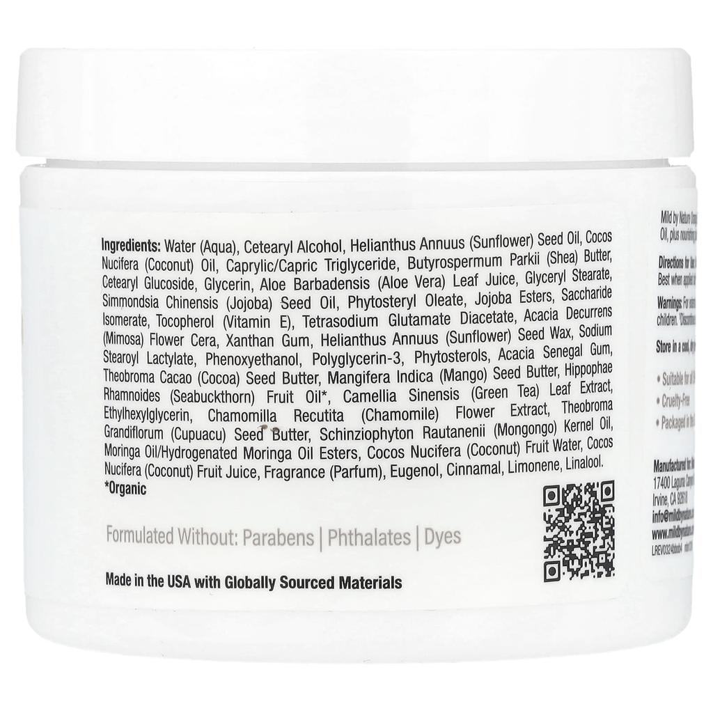 purified water, cetearyl alcohol, sunflower (helianthus annuus) seed oil*, coconut (cocos nucifera) oil*, caprylic/capric triglyceride, aloe barbadensis leaf juice*, glycerin*, shea butter*, cetearyl glucoside, glyceryl stearate, jojoba (simmondsia chinensis) seed oil*, phytosteryl oleate, jojoba ester, saccharide isomerate, tocopherol, fragrance (parfum), tetrasodium glutamate diacetate, mimosa (acacia decurren) flower wax, xanthan gum, sunflower (helianthus annuus) seed wax, sodium stearoyl lactylate, bergamot (citrus aurantium bergamia) fruit oil, phenoxyethanol, polyglycerin-3, phytosterol, acacia gum, cocoa seed butter, mango (mangifera indica) butter, sea buckthorn (hippophae rhamnoides) fruit extract, green tea (camellia sinensis) extract*, ethylhexylglycerin, matricaria flower (chamomile) extract, cupuacu (theobroma grandiflorum) seed butter, mongongo (schinziophyton rautanenil) seed oil, hydrogenated moringa oil esters, coconut (cocos nucifera) liquid endosperm, glycerin, citric acid, coconut (cocos nucifera) fruit juice, sodium citrate. *organic