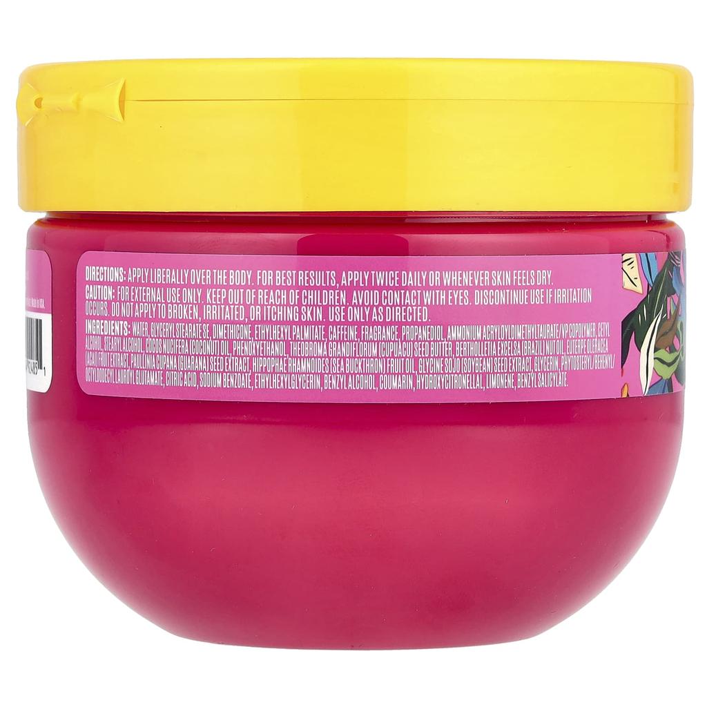 purified water, glyceryl stearate se, dimethicone, ethylhexyl palmitate, caffeine, fragrance, propanediol, ammonium acryloyldimethyl taurate/vp copolymer, cetyl alcohol, stearyl alcohol, coconut (cocos nucifera) oil, phenoxyethanol, cupuaçu (theobroma grandiflorum) seed butter, brazil (bertholletia excelsa) nut oil, acai berry (euterpe oleracea) fruit extract, guarana (paulinia cupana) seed extract, sea buckthorn (hippophae rhamnoides) fruit oil, glycine soju (soybean) seed extract, glycerin, phytosteryl/behenyl/octyldodecyl lauroyl glutamate, citric acid, sodium benzoate, ethylhexylglycerin, benzyl alcohol, coumarin, hydroxycitronellal, limonene, benzyl salicylate. ingredients sourced from around the world.