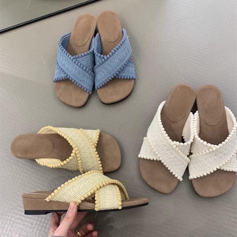 Винтажные шлепанцы на толстой танкетке с плетеными перекрещенными ремешками, уличные сандалии, отпуск, пляж, крутые шлепанцы