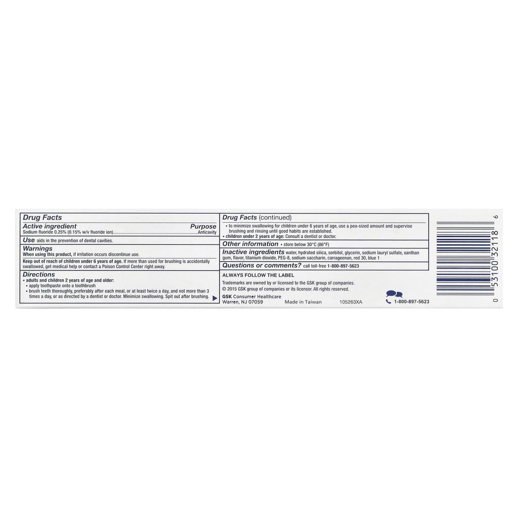ингредиенты: информация о лекарствеДействующее вещество ПрименениеФторид натрия 0,25% (Процентное содержание фторид-ионов по весу/объему 0,15%)Профилактика кариесаДругие ингредиенты: очищенная вода, гидратированный диоксид кремния, сорбит, глицерин, лаурилсульфат натрия, ксантановая камедь, ароматизатор, диоксид титана, ПЭГ-8, сахаринат натрия, каррагинан, красный №. 30, синий Нет. 1.