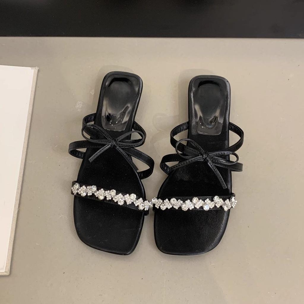 Сланцы с бантиком из стразов для женской летней носки, новая нежная модель, сочетающаяся с юбкой, красивые сандалии на толстом каблуке