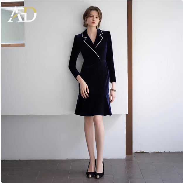 2024 Ранняя осень Темно-синее бархатное женское формальное платье с оборками и длинными рукавами