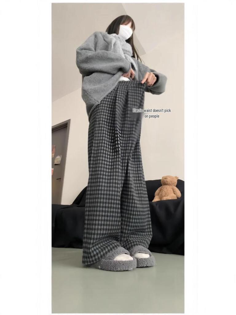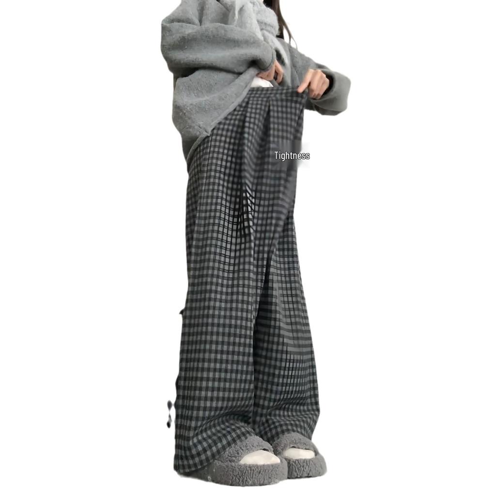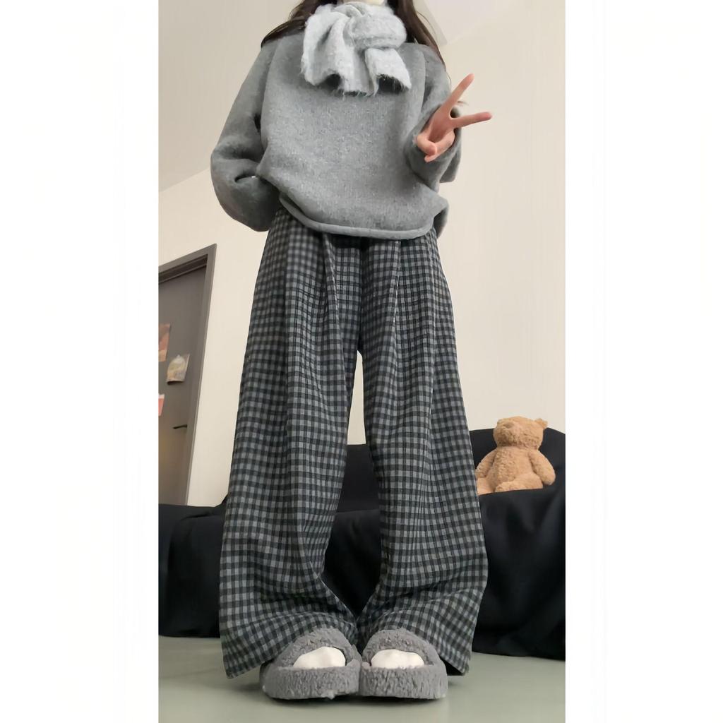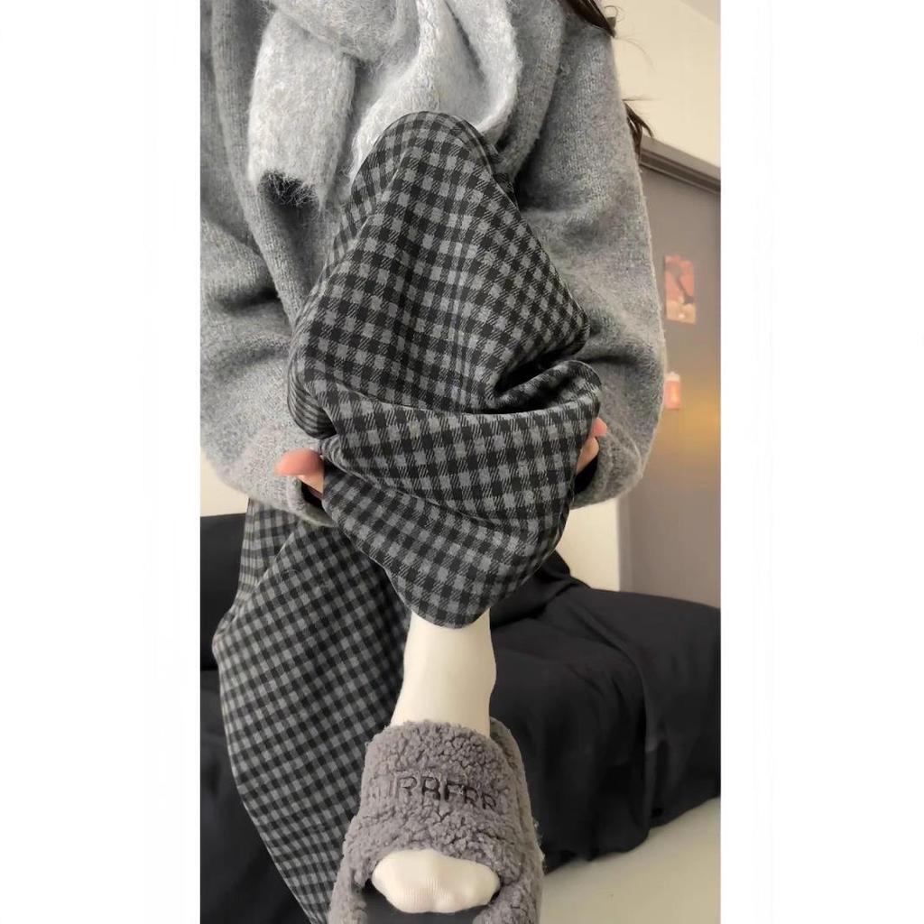 Ретро Цветной Блок Клетчатые Брюки с Широкими Штанинами на Флисовой Подкладке - Женский Осенне-Зимний Свободный Повседневный Стиль