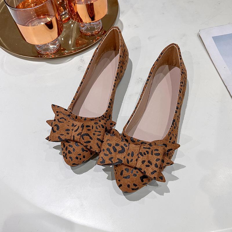 Трансграничные большие размеры весна и лето новые леопардовый принт бант остроносые балетки женские туфли с мелким вырезом повседневные туфли