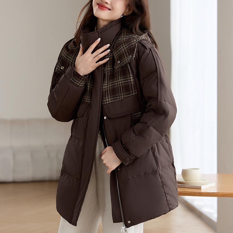 Модное женское пуховое пальто с капюшоном 2024: Средней длины, Легкий, Лоскутный дизайн