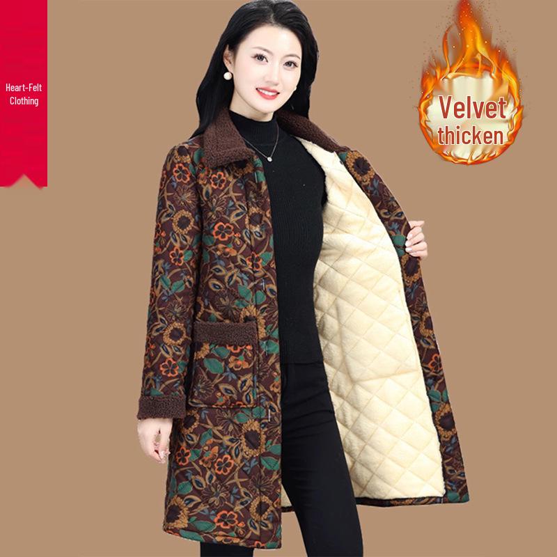 Женское хлопковое пальто средней длины с цветочным принтом и флисовой подкладкой - Зимний утепленный стиль для женщин среднего и пожилого возраста — купить товар онлайн с бесплатной доставкой до всему миру!