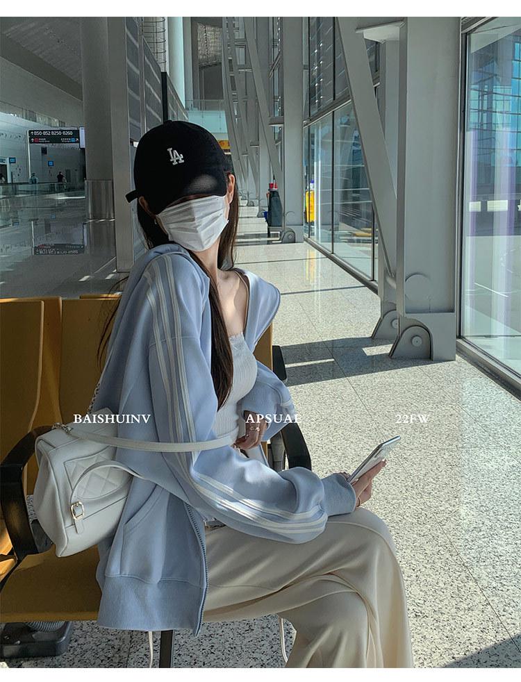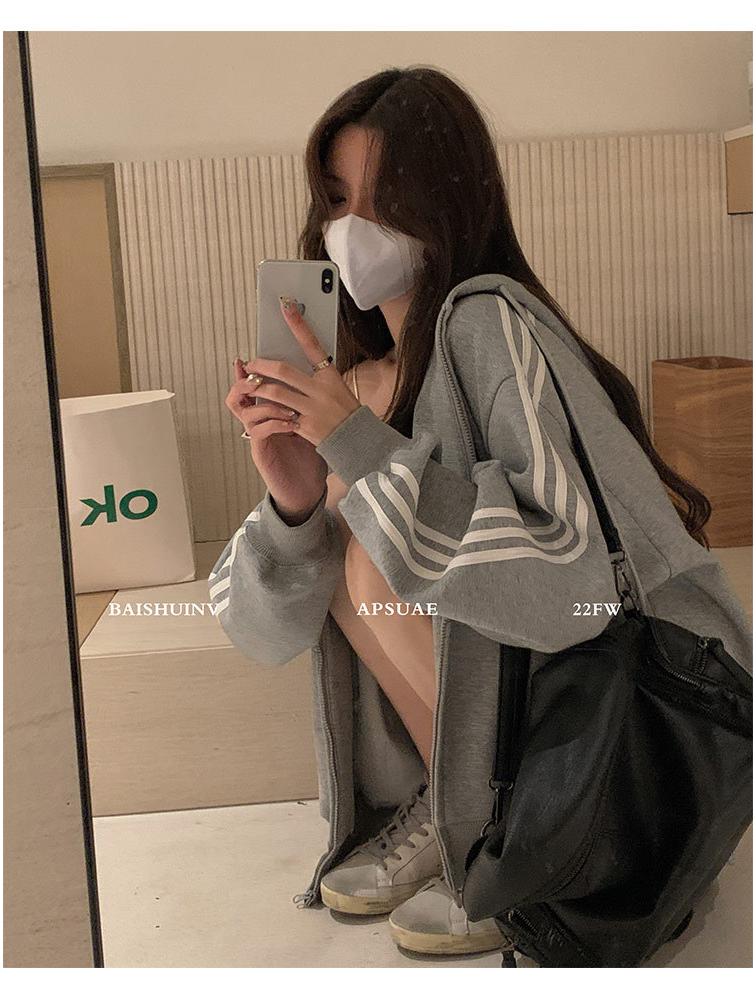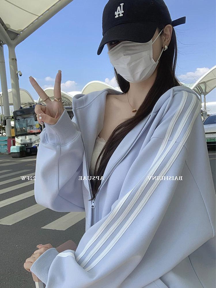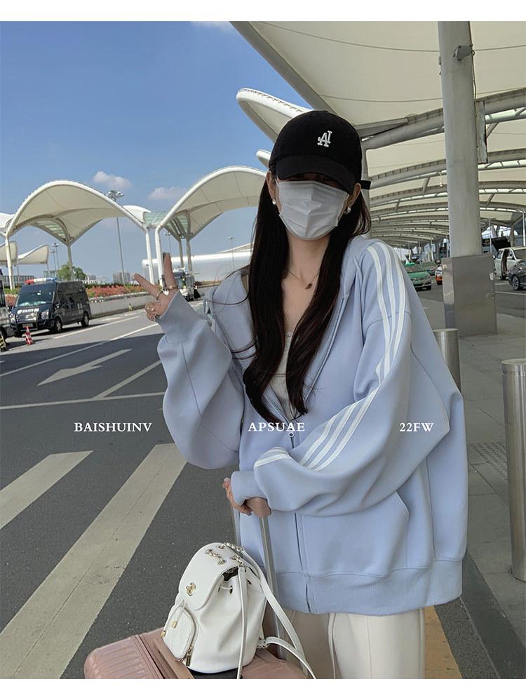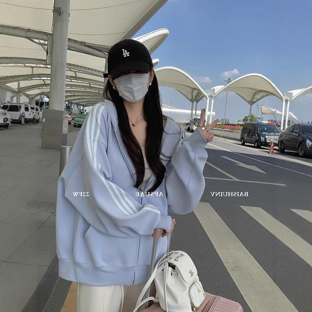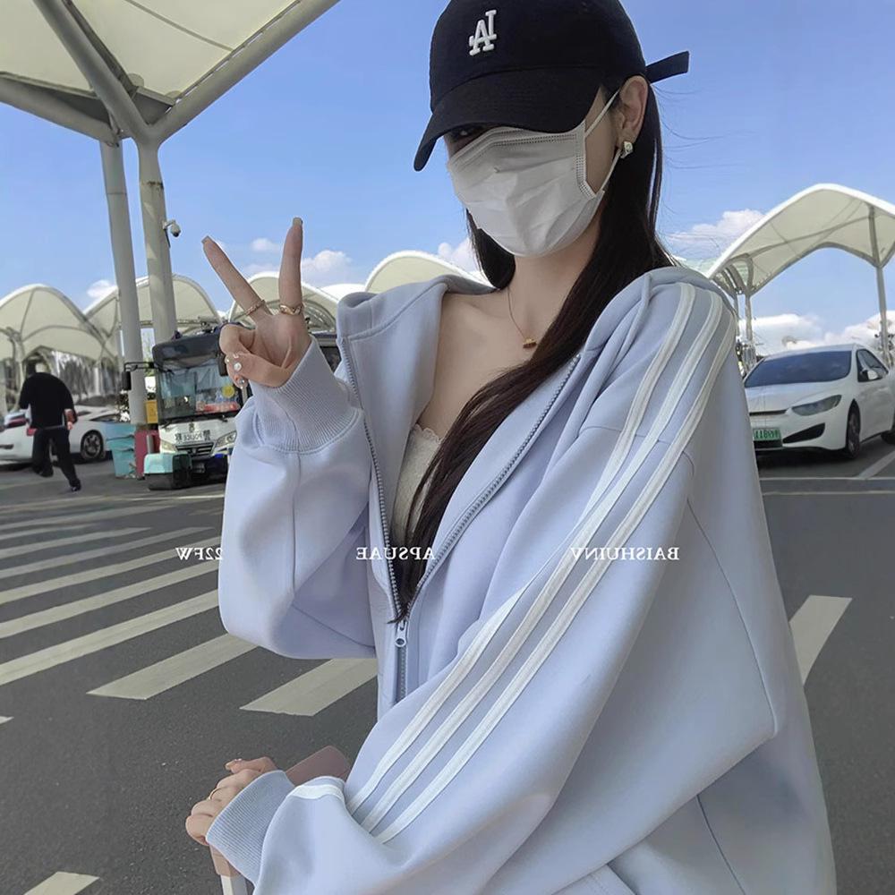 Женский синий кардиган-свитшот оверсайз, 2025 год, в корейском стиле, с прямым плечом, свободного кроя, идеально подходит для весны и осени.