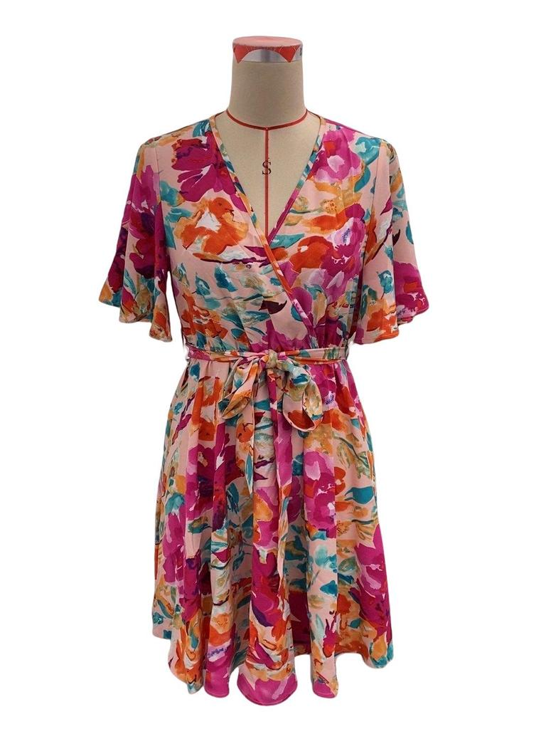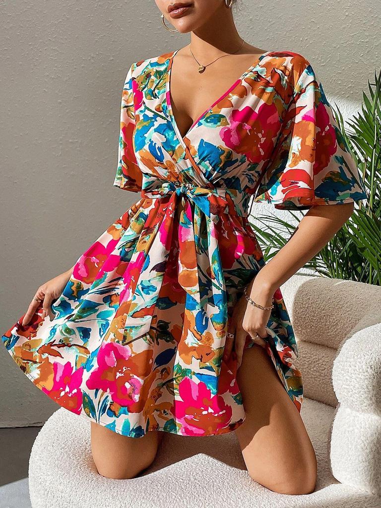 Летнее платье 2025 года с цветочным принтом, перекрещенной горловиной и завязкой на талии для женщин