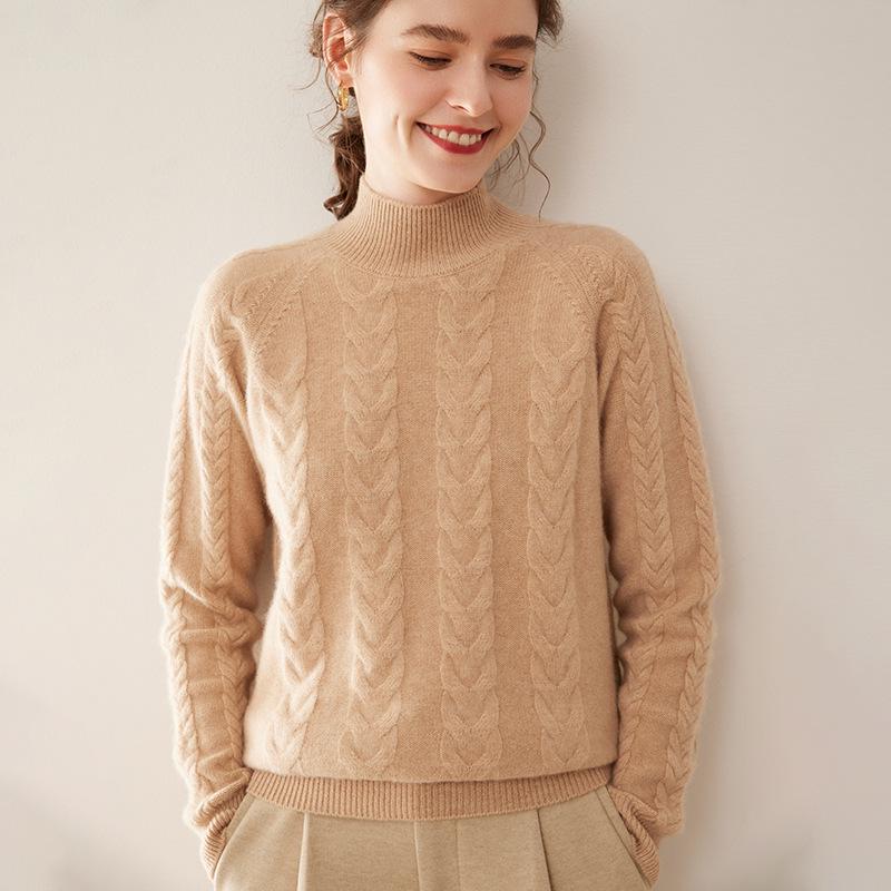 Женский кашемировый свитер однотонного цвета с узором «косы», полувысоким воротником, свободного кроя — купить товар онлайн с бесплатной доставкой до всему миру!