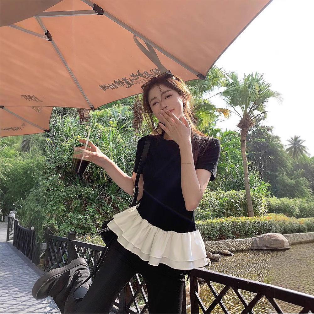 В наличии женская футболка с лоскутным кружевом, рукавами-фонариками и приталенного силуэта